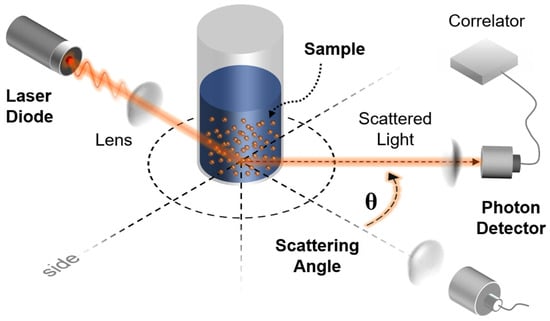 Laser beam irradiation and scattering model. The waves of laser beam is generated through the diode, and penetrated through lenses. Nanoparticles in the solution scatters the pathway of the waves. Then the phonon detector recognizes the angle of scattered light.