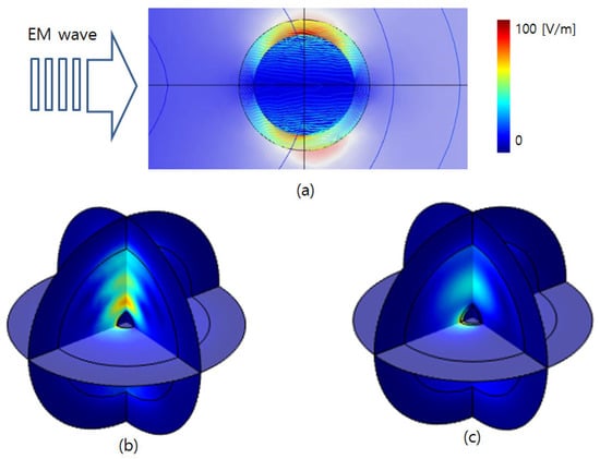 Electric field response for (a) excitation direction, (b) a nanoparticle with an SAM layer, and (c) a nanoparticle.