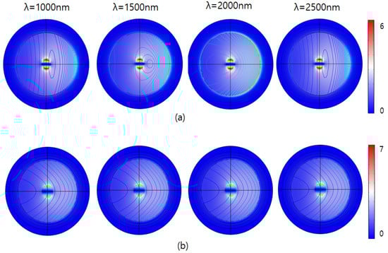 Figure 5 illustrates the electric field responses (V/m) of the nanoparticles under infrared (IR) illumination, at wavelengths ranging from 1000 nm to 2500 nm. Similar to previous observations, nanoparticles are presented in two configurations: nanoparticles coated with a 30 nm-thick self-assembled monolayer (SAM) in row (a), and nanoparticles without SAM coating in row (b). Electric field intensities are color-coded, with red representing higher intensities and blue indicating lower intensities.