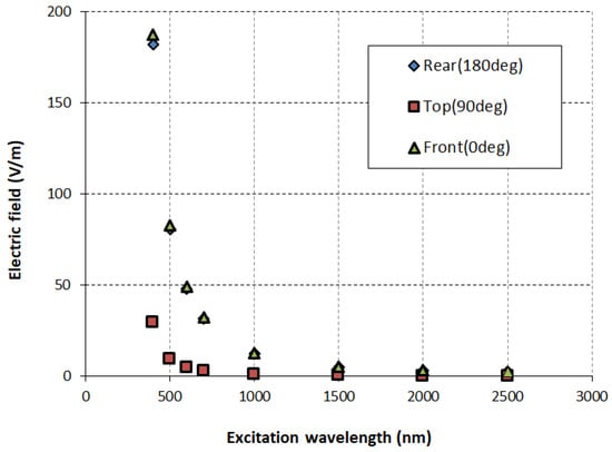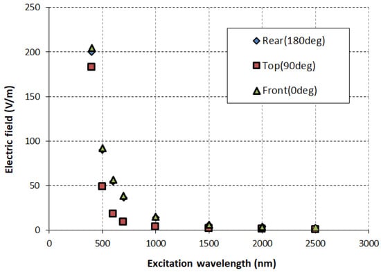 Figure 8 shows the relative intensity (Ecollioid/Eparticle) at three different detection angles—rear (180°), top (90°), and front (0°)—across a broad wavelength range (approximately 300 nm to 2500 nm). The relative intensity, expressed as a percentage, illustrates how strongly electromagnetic fields are enhanced or attenuated by nanoparticle colloids compared to single particles at different viewing angles. The data reveal that the top angle (90°, red squares) demonstrates significant field enhancement, varying roughly between 350% and 650% across the measured wavelengths, with peak intensity at shorter wavelengths (400–500 nm). Conversely, observations from both front (0°, green triangles) and rear (180°, blue diamonds) angles exhibit much lower and more stable relative intensities, approximately 100–120%, indicating minimal enhancement across all wavelengths. This implies strong angular dependence, with maximum electromagnetic enhancement specifically detected perpendicularly (90°) to the particle alignment. Such information is crucial for optical applications where directional electromagnetic enhancement must be optimized.