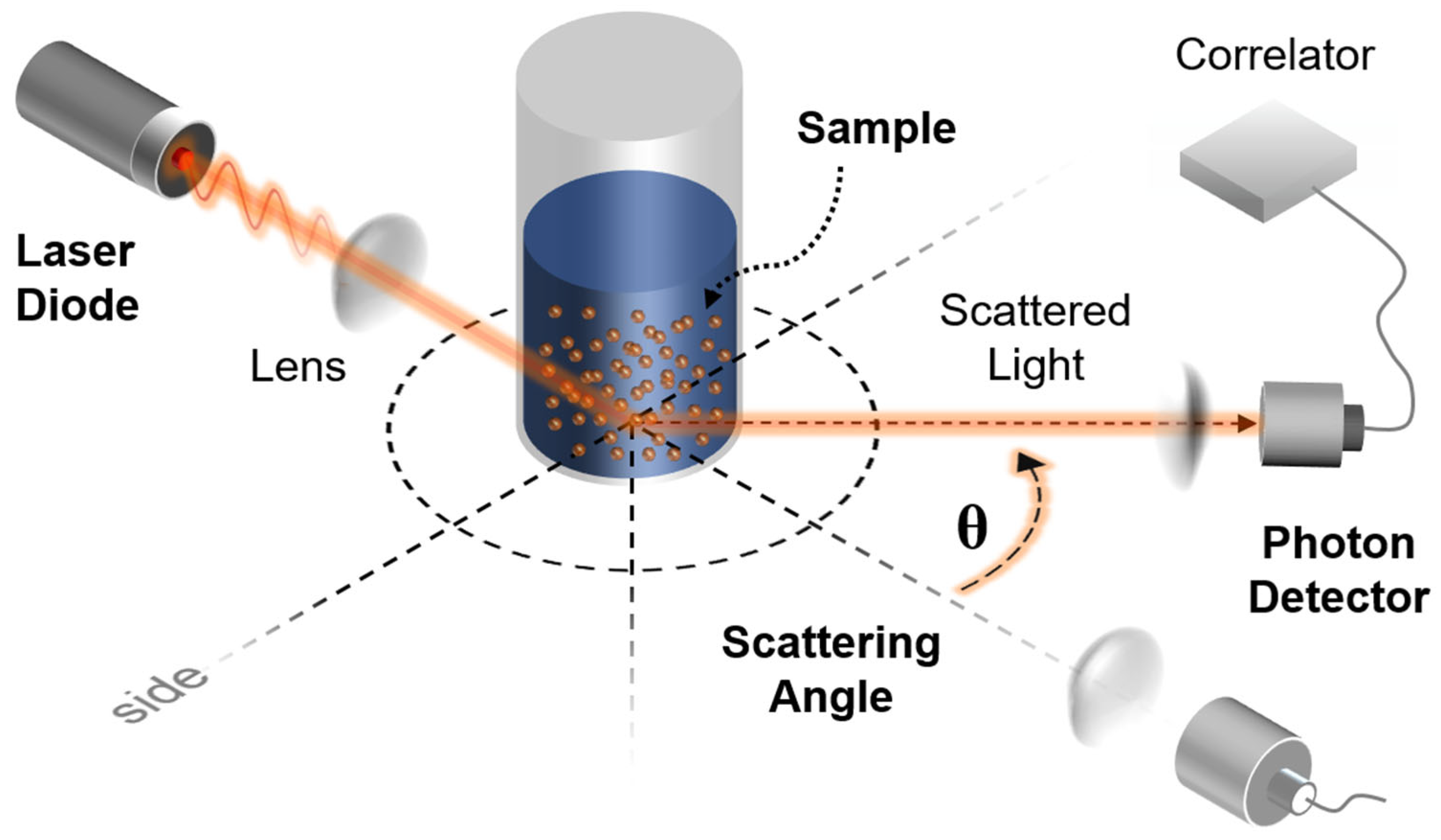 Figure 1. Laser beam irradiation and scattering model. The waves of laser beam is generated through the diode, and penetrated through lenses. Nanoparticles in the solution scatters the pathway of the waves. Then the phonon detector recognizes the angle of scattered light.