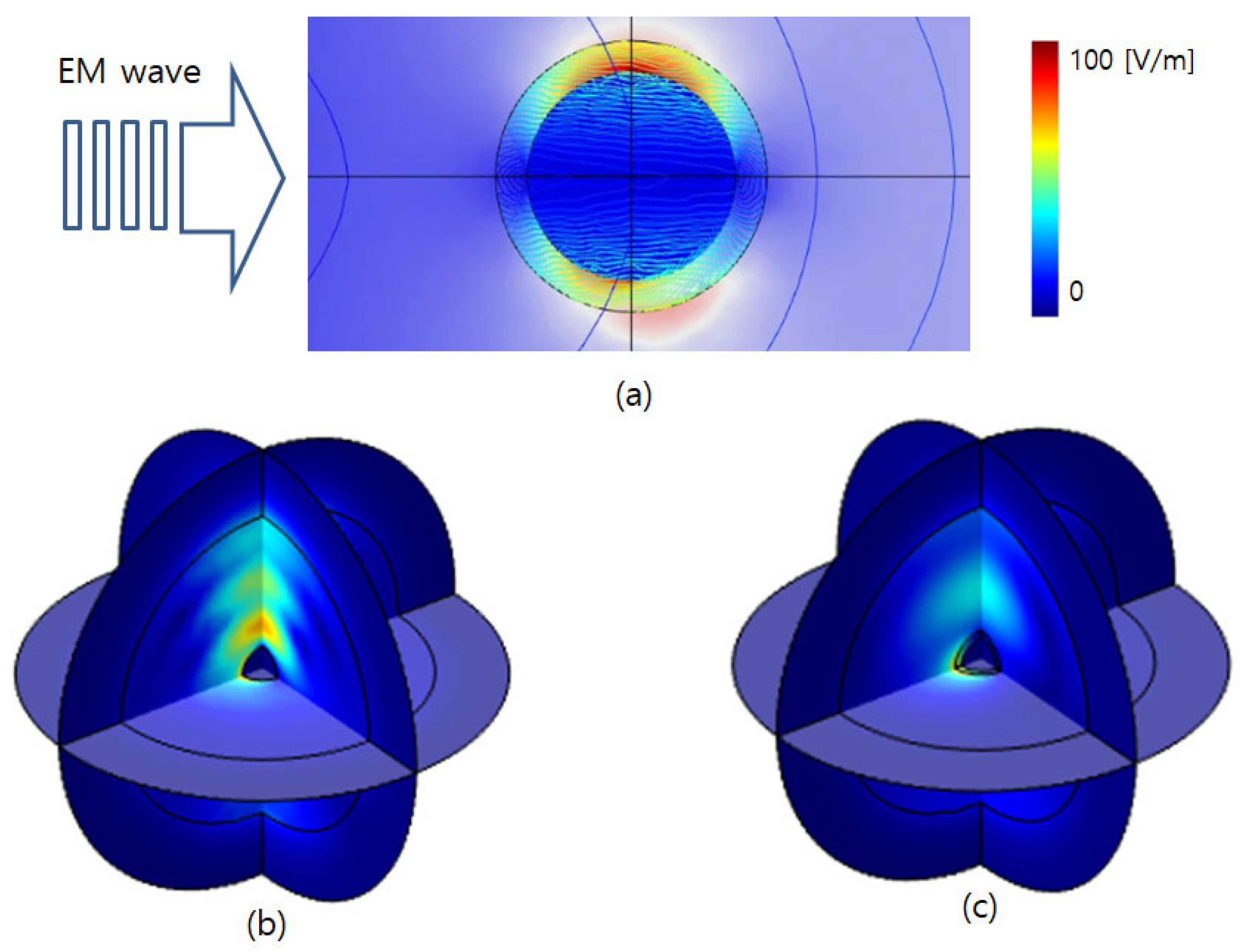 Figure 3. Electric field response for (a) excitation direction, (b) a nanoparticle with an SAM layer, and (c) a nanoparticle.