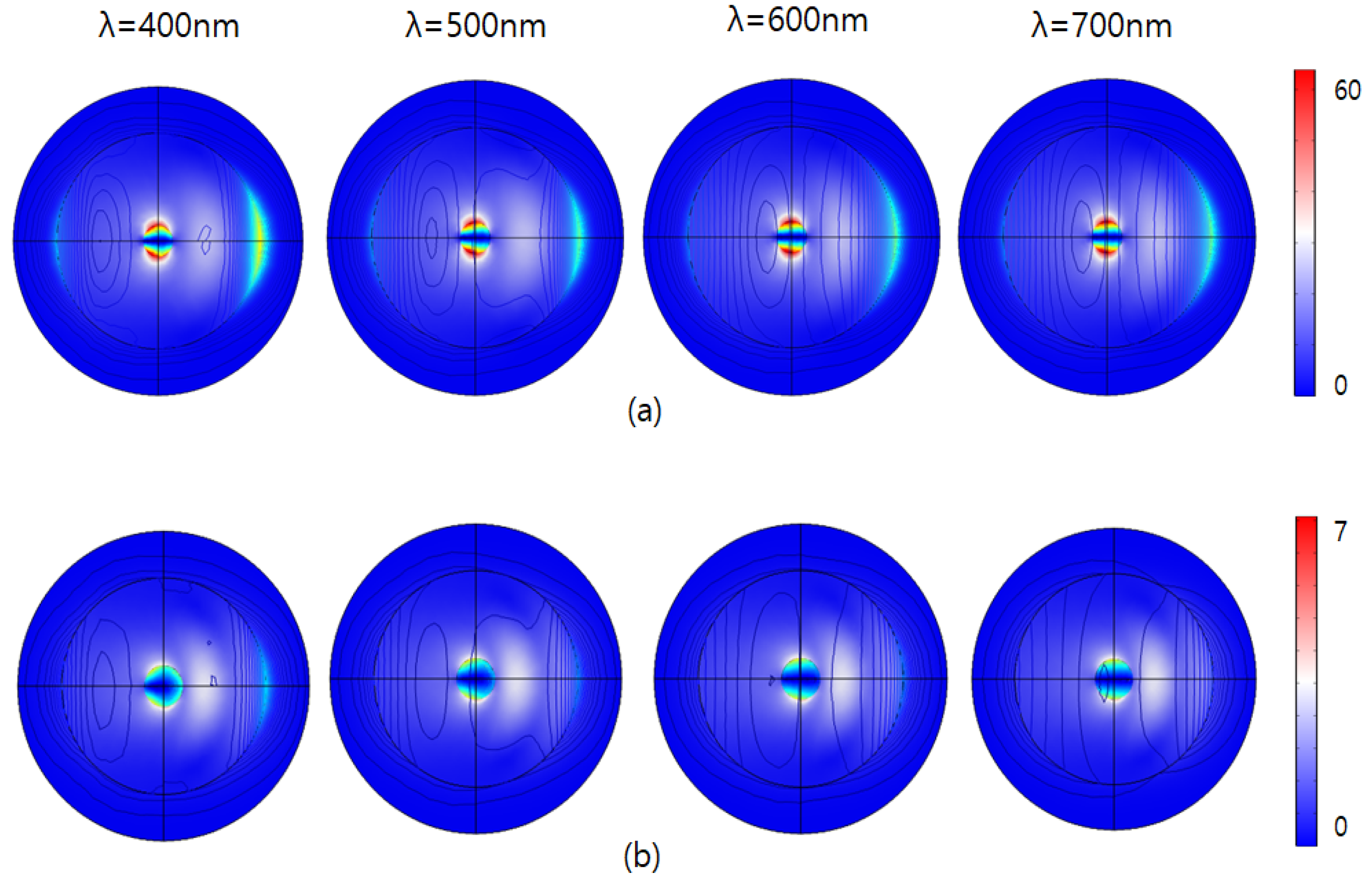 Figure 4. E-field intensity |E|/|E0| by visible range laser for (a) with an SAM (b) without an SAM.