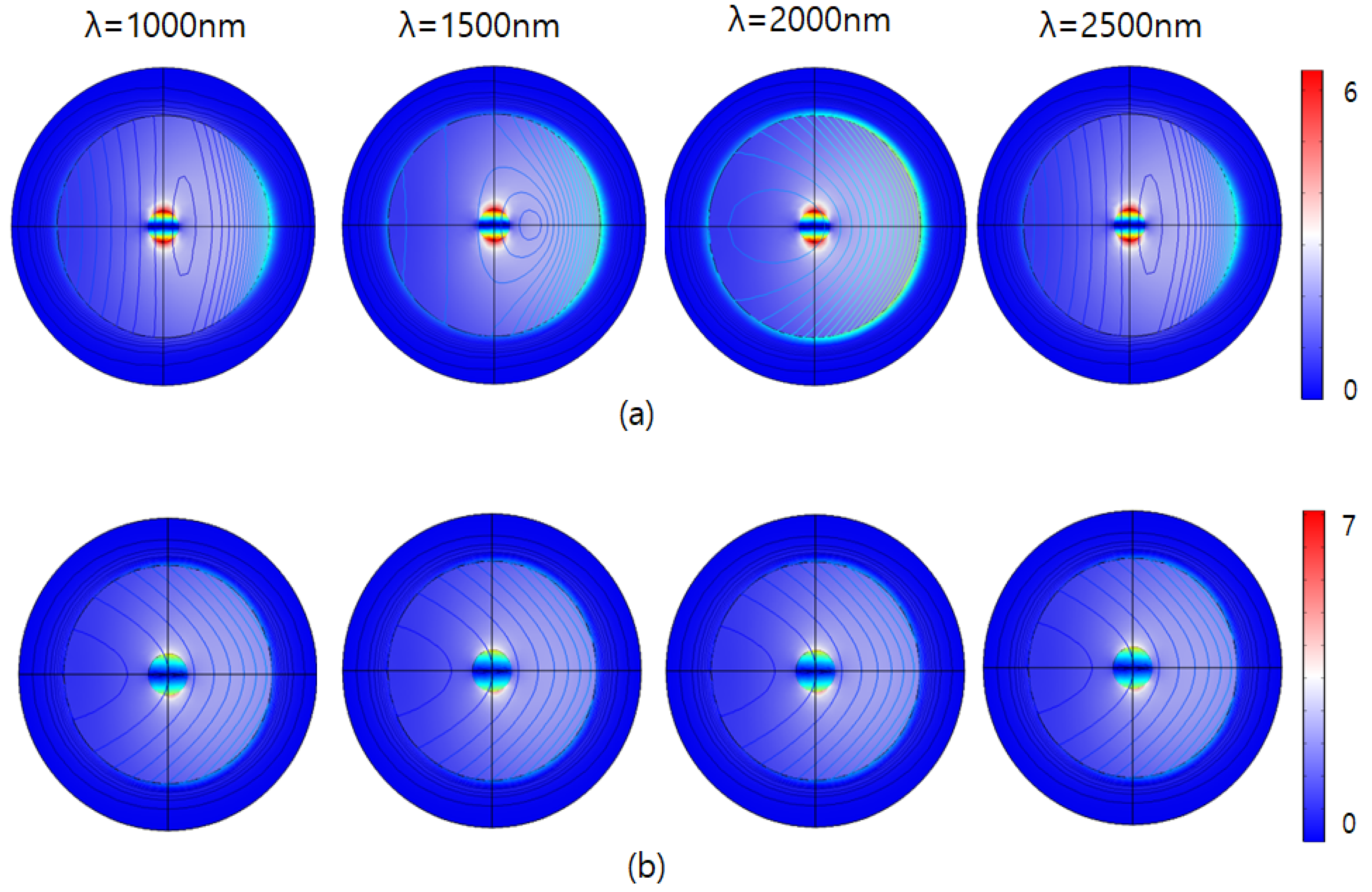 Figure 5 illustrates the electric field responses (V/m) of the nanoparticles under infrared (IR) illumination, at wavelengths ranging from 1000 nm to 2500 nm. Similar to previous observations, nanoparticles are presented in two configurations: nanoparticles coated with a 30 nm-thick self-assembled monolayer (SAM) in row (a), and nanoparticles without SAM coating in row (b). Electric field intensities are color-coded, with red representing higher intensities and blue indicating lower intensities.