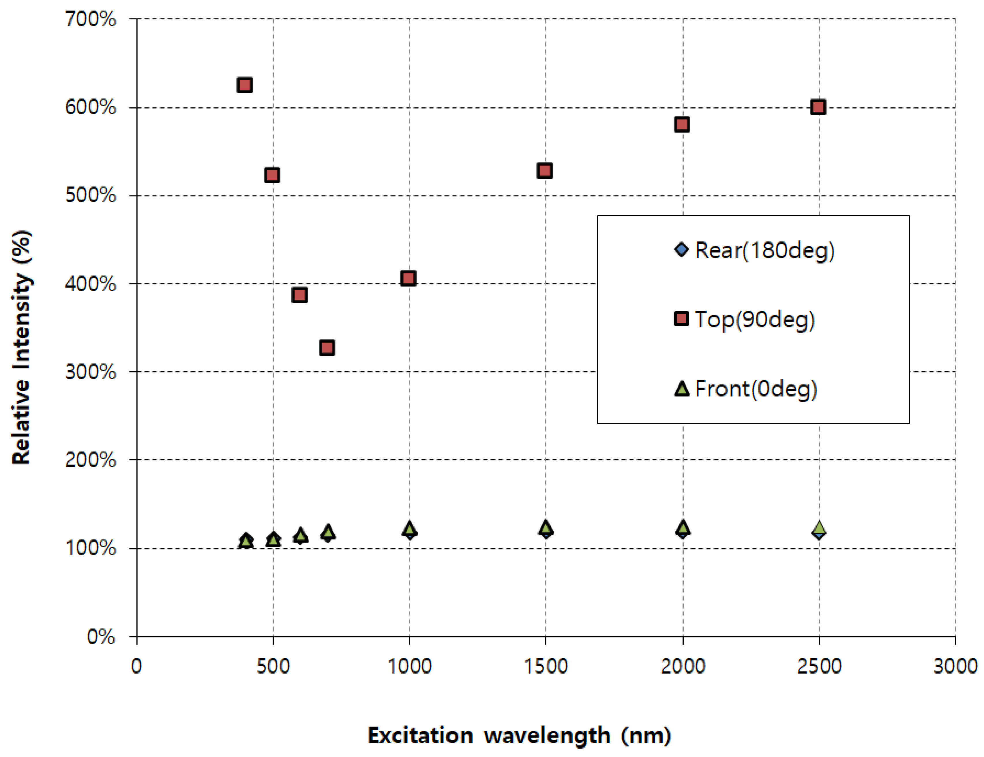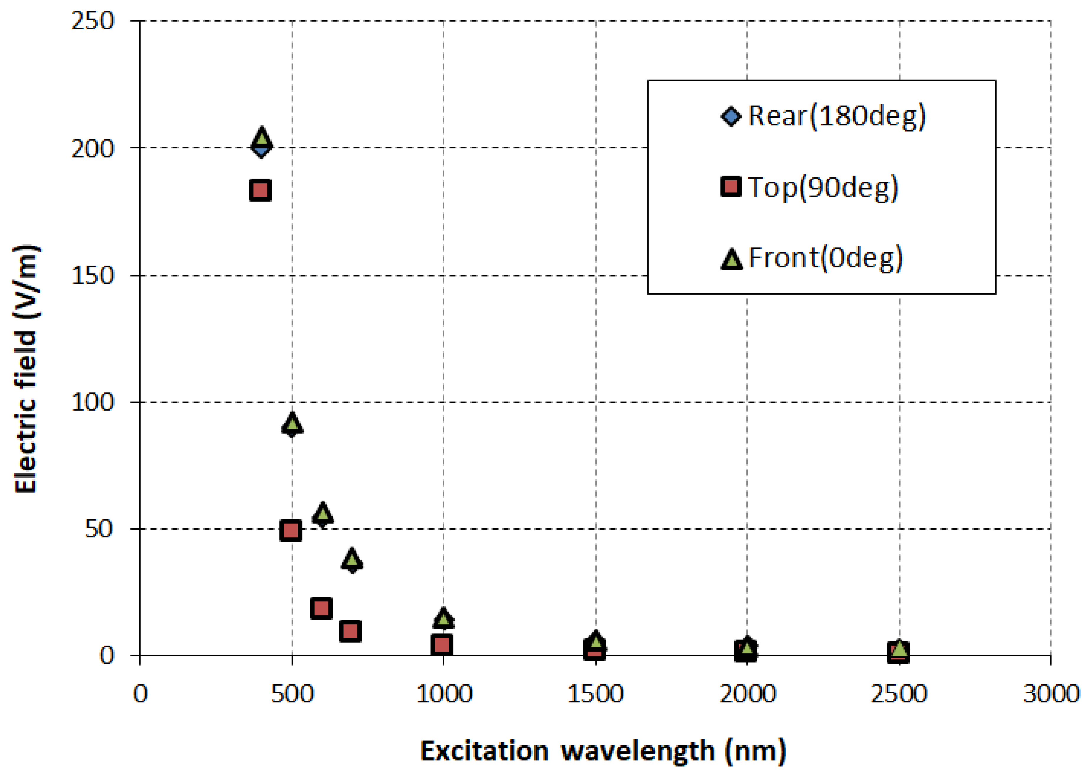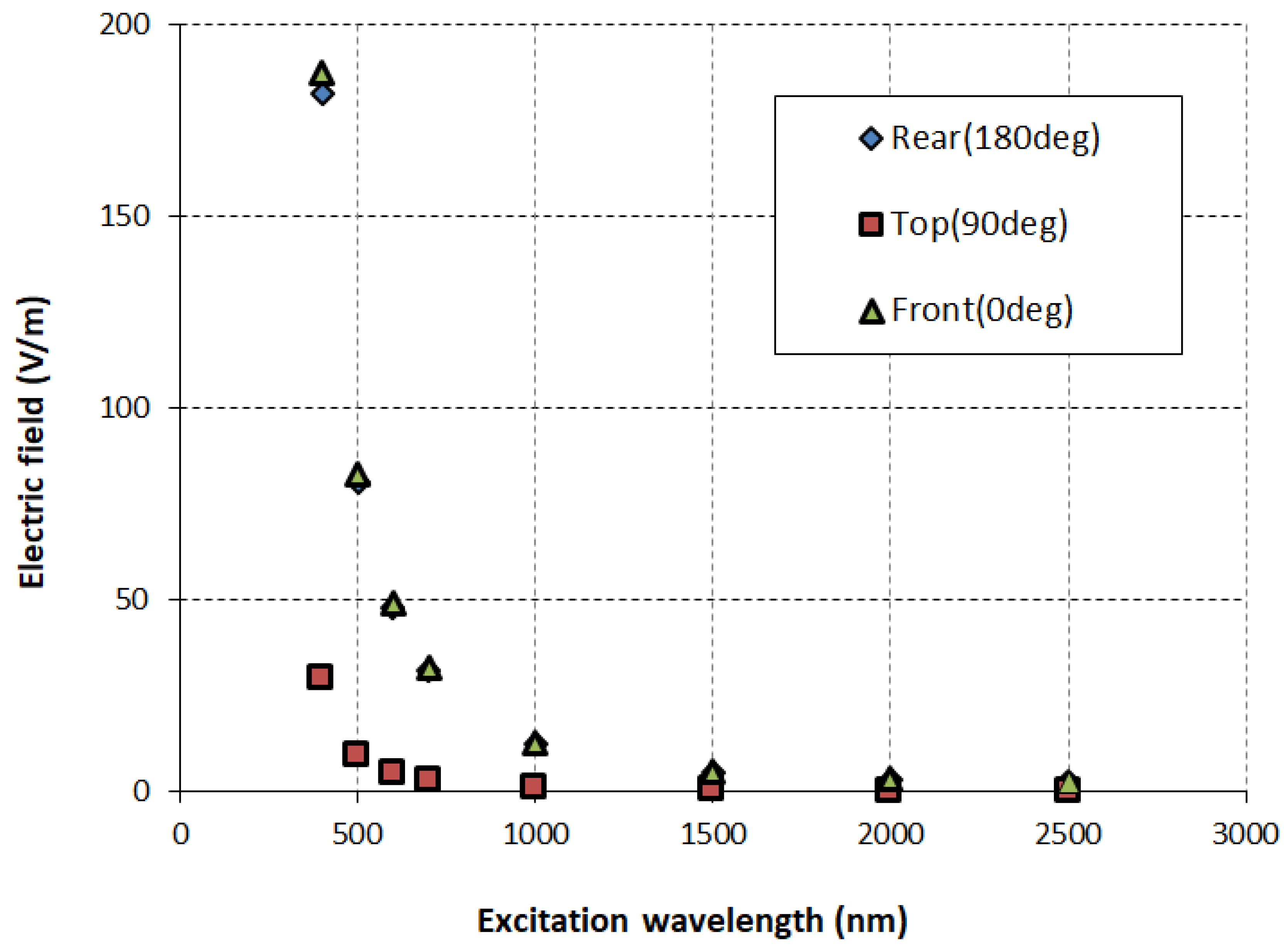 Figure 8 shows the relative intensity (Ecollioid/Eparticle) at three different detection angles—rear (180°), top (90°), and front (0°)—across a broad wavelength range (approximately 300 nm to 2500 nm). The relative intensity, expressed as a percentage, illustrates how strongly electromagnetic fields are enhanced or attenuated by nanoparticle colloids compared to single particles at different viewing angles. The data reveal that the top angle (90°, red squares) demonstrates significant field enhancement, varying roughly between 350% and 650% across the measured wavelengths, with peak intensity at shorter wavelengths (400–500 nm). Conversely, observations from both front (0°, green triangles) and rear (180°, blue diamonds) angles exhibit much lower and more stable relative intensities, approximately 100–120%, indicating minimal enhancement across all wavelengths. This implies strong angular dependence, with maximum electromagnetic enhancement specifically detected perpendicularly (90°) to the particle alignment. Such information is crucial for optical applications where directional electromagnetic enhancement must be optimized.