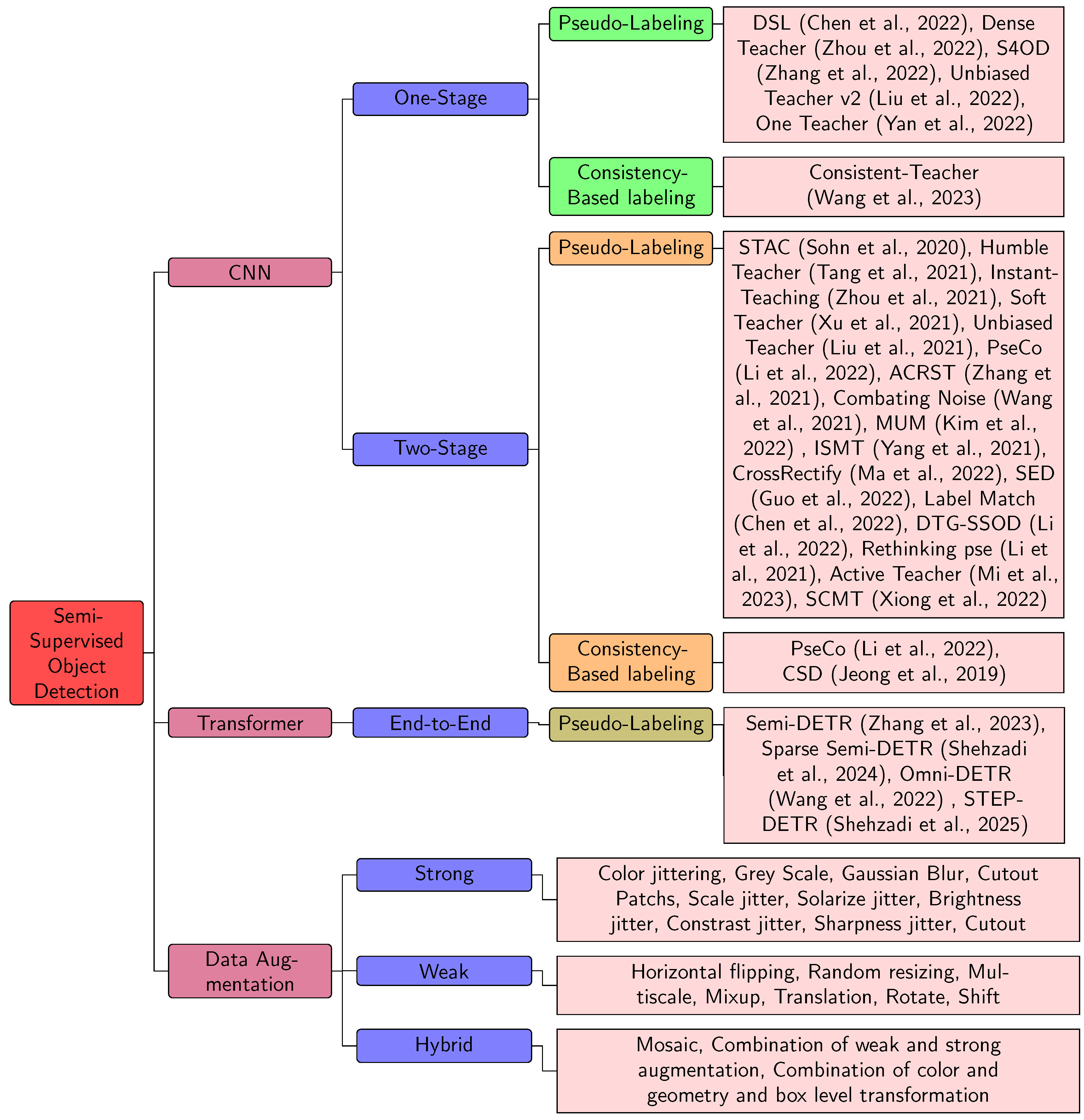 | SED [88] | Improves Semi-Supervised Object Detection by enforcing scale consistency and self-distillation. | Reliance on the IoU threshold criterion, which could not be optimal for all detectors and situations, and its limited benefits from multi-scale testing |
