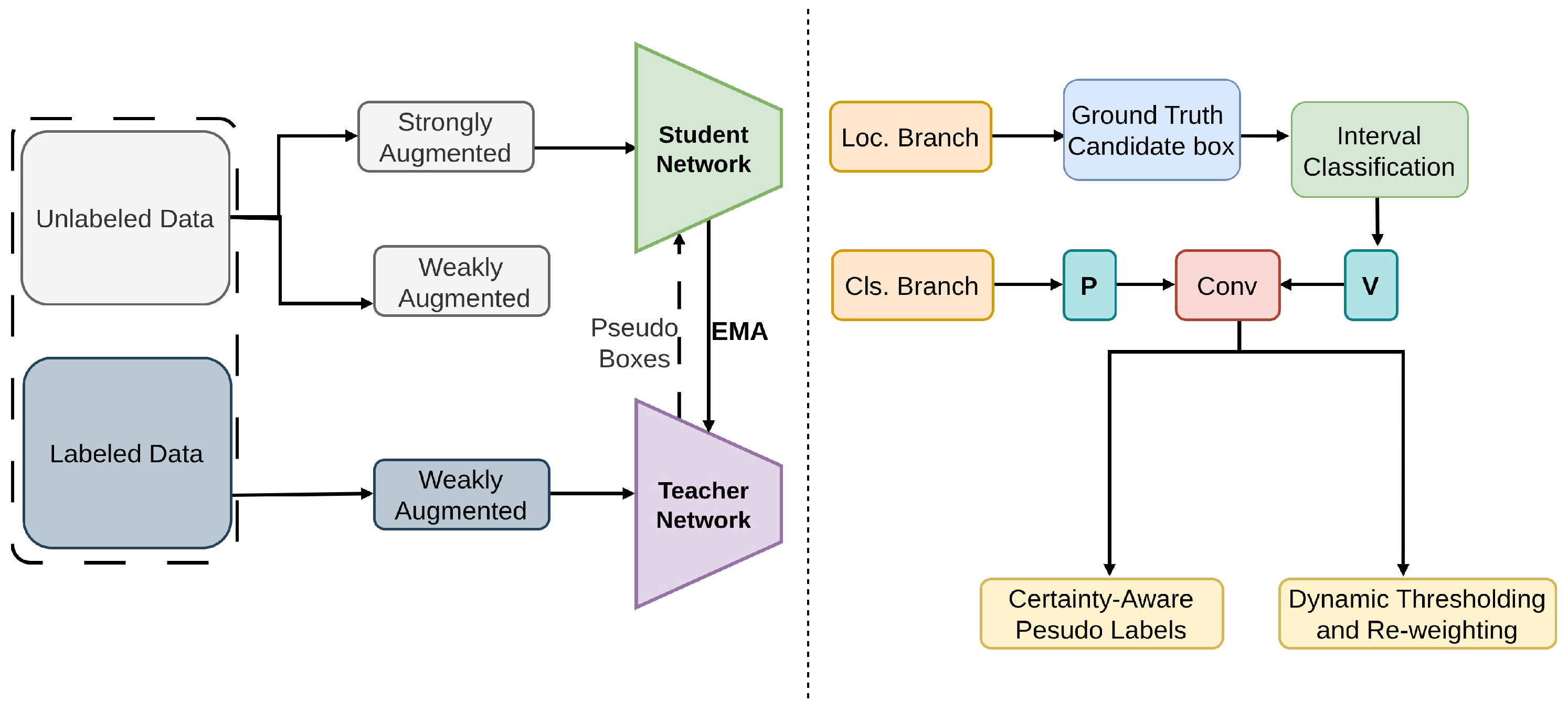 | Cross Rectify [87] | Enhances pseudo label quality and detection performance by rectifying misclassified bounding boxes using detector disagreements. | Simultaneous training of two detectors increase computational overhead, potentially prolonging training time and resource usage. |