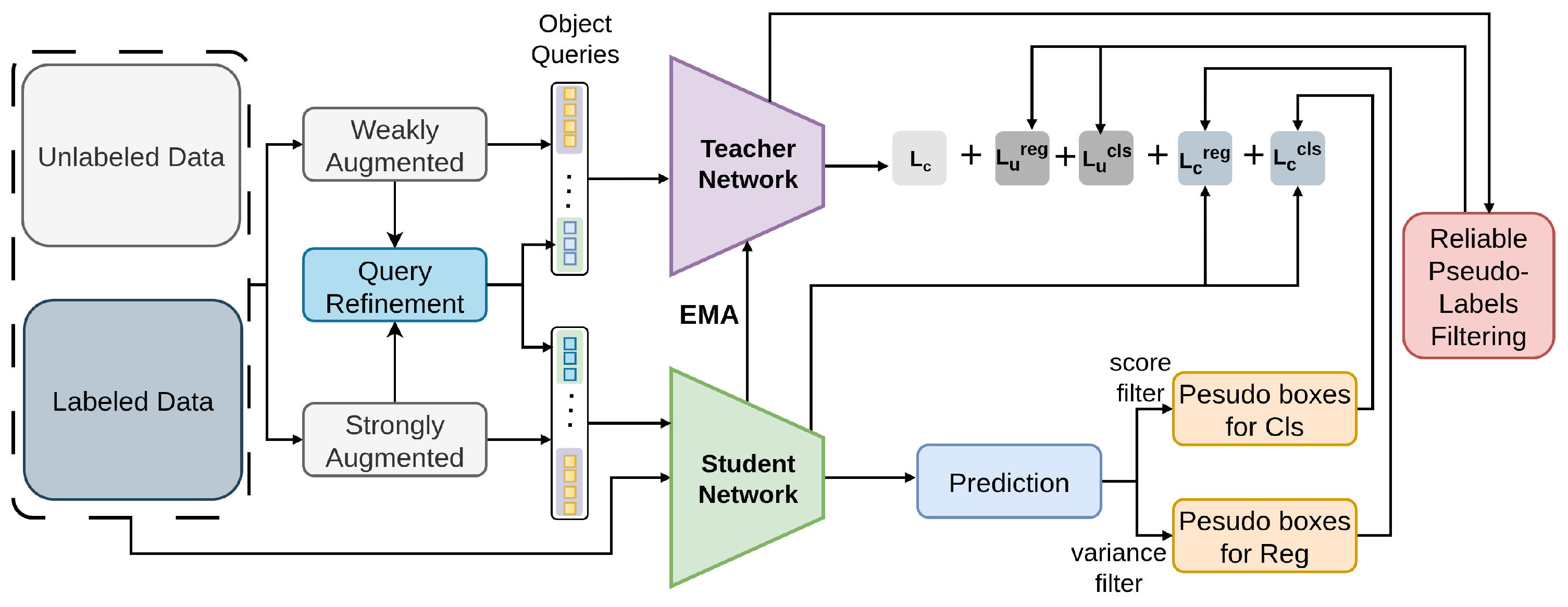 | PseCo [76] | Enhances SSOD by integrating object detection attributes into pseudo labeling along with consistency training, leading to superior performance and faster convergence. | Its potential struggle with generalization across diverse datasets due to variability in pseudo-label quality. |