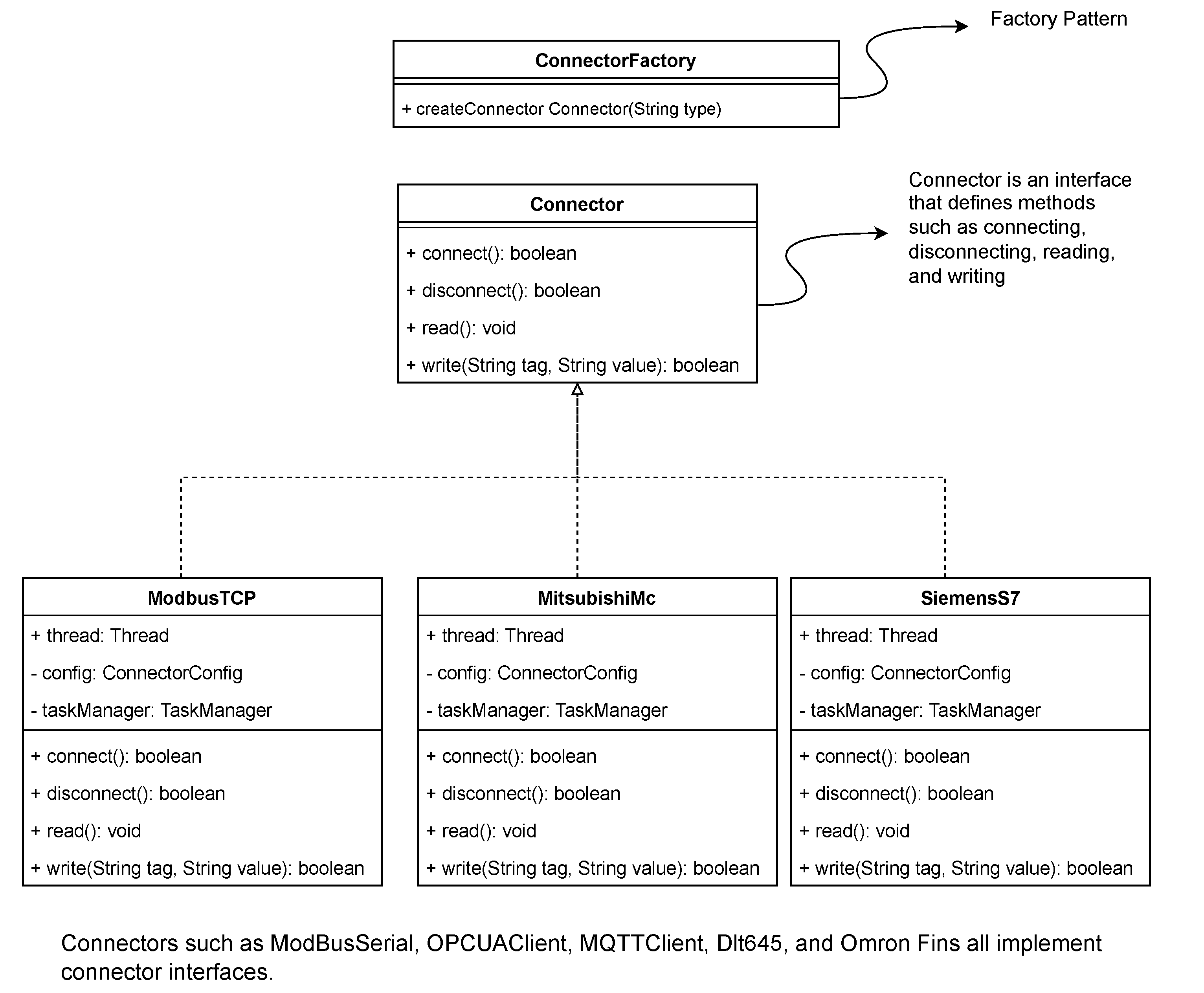 - Connectors (Strategy & Factory Pattern): To support a wide array of protocols (Modbus, Siemens S7, etc.) while adhering to the Open/Closed Principle (OCP), we employ a combination of the Strategy Pattern and Factory Pattern. A unified Connector interface defines standard methods (connect, disconnect, read, write). Specific protocol implementations (e.g., ModbusConnector, OpcUaConnector) implement this interface. At runtime, the Connector Manager uses a Factory to dynamically instantiate the correct strategy based on the configuration. This design allows new protocols to be added by simply creating a new class without modifying existing code. As illustrated in Figure 2.
