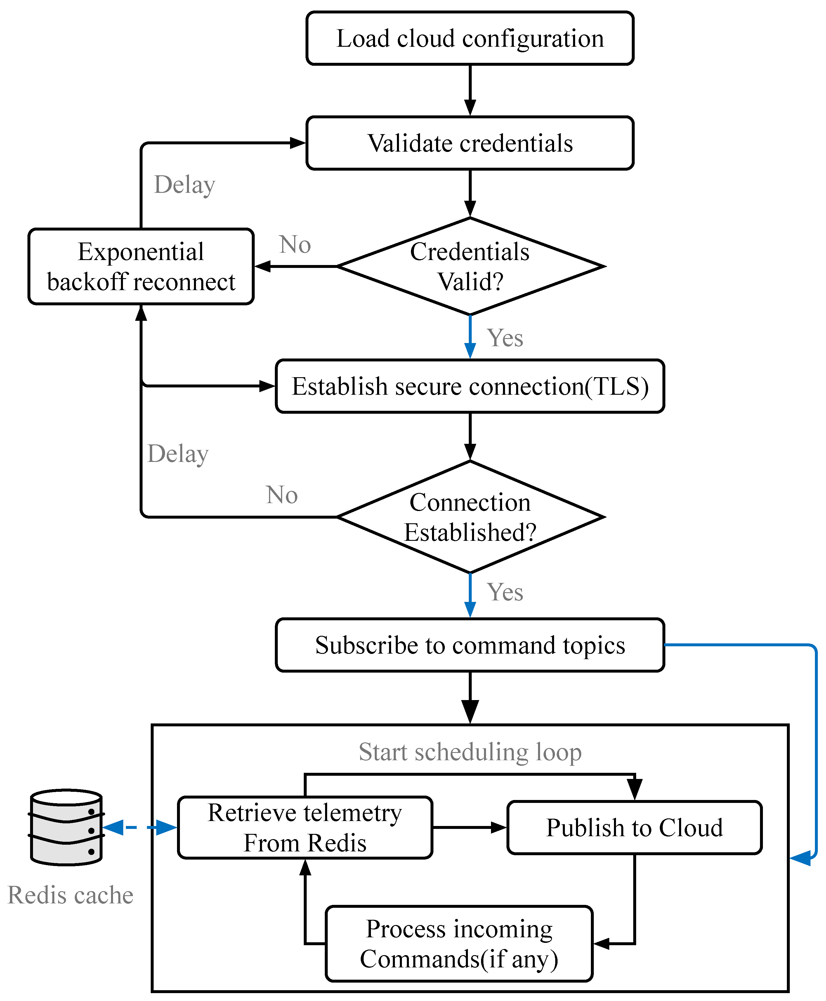 - Level 4 (Northbound): The Northbound Component establishes a secure socket connection to the configured cloud endpoint and begins the scheduling loop.