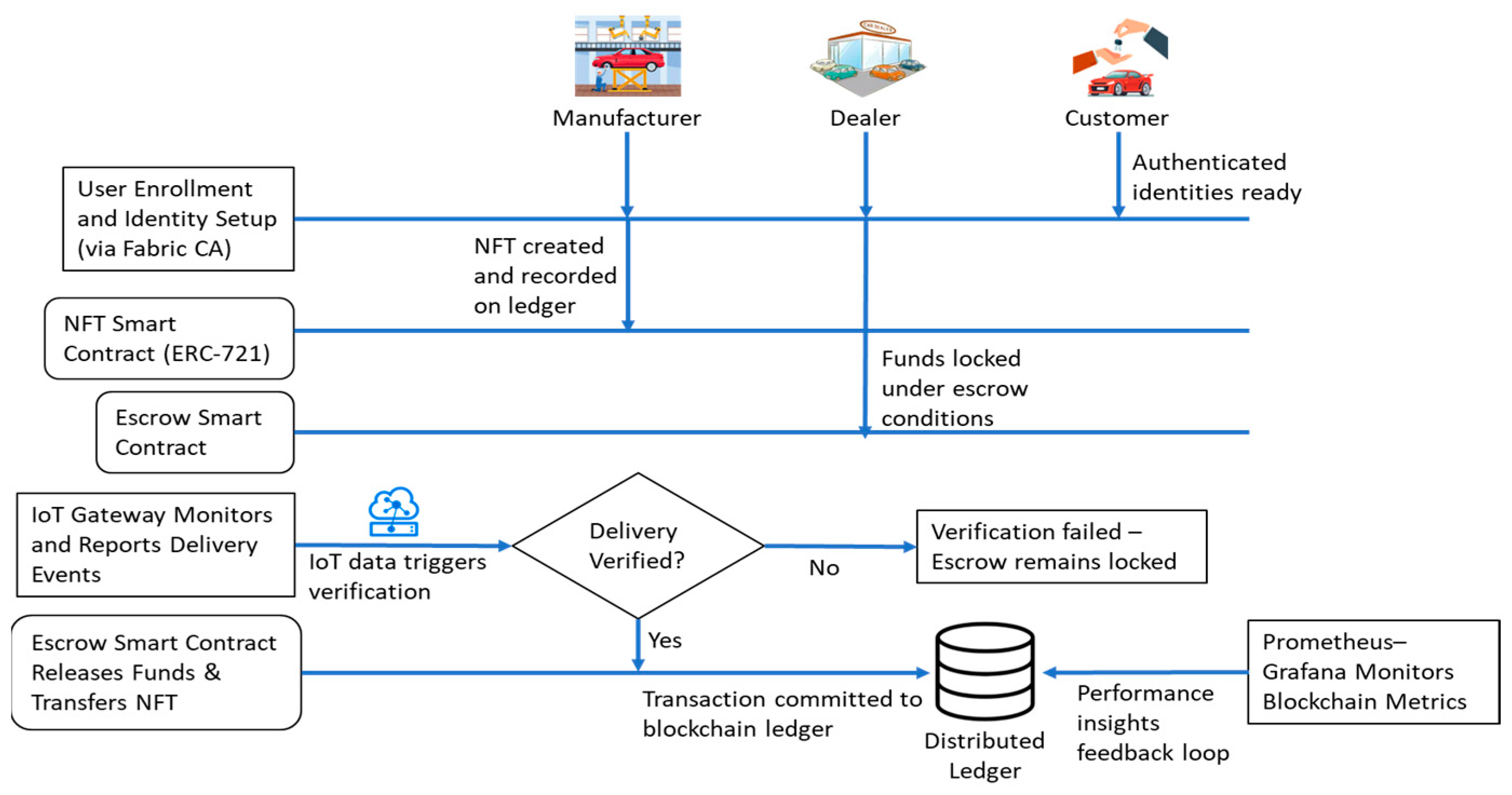Figure 2 illustrates the sequential processes of the proposed system, starting with the stakeholder registration with Fabric CA, the creation of assets based on NFT, escrow payment initiation, delivery verification by IoT, and automatic release of payments with smart contracts [