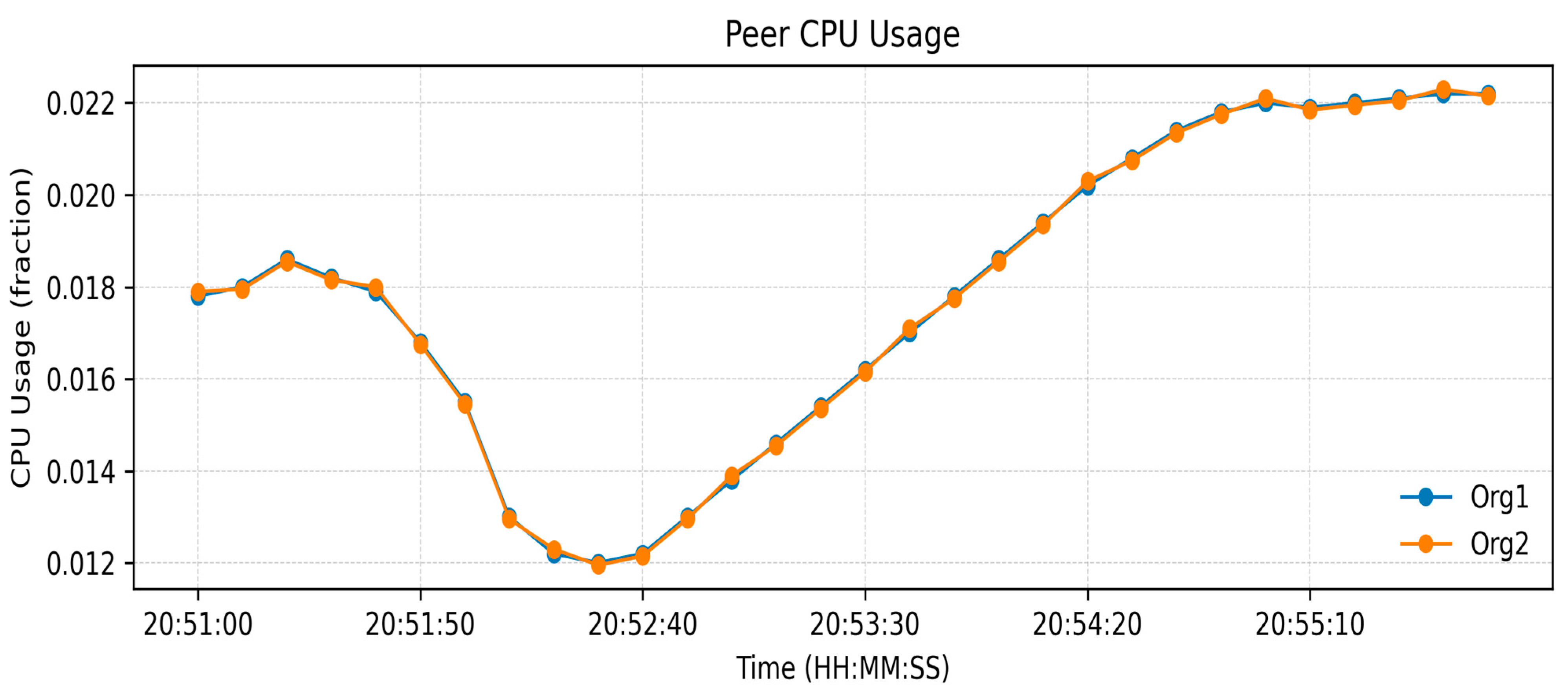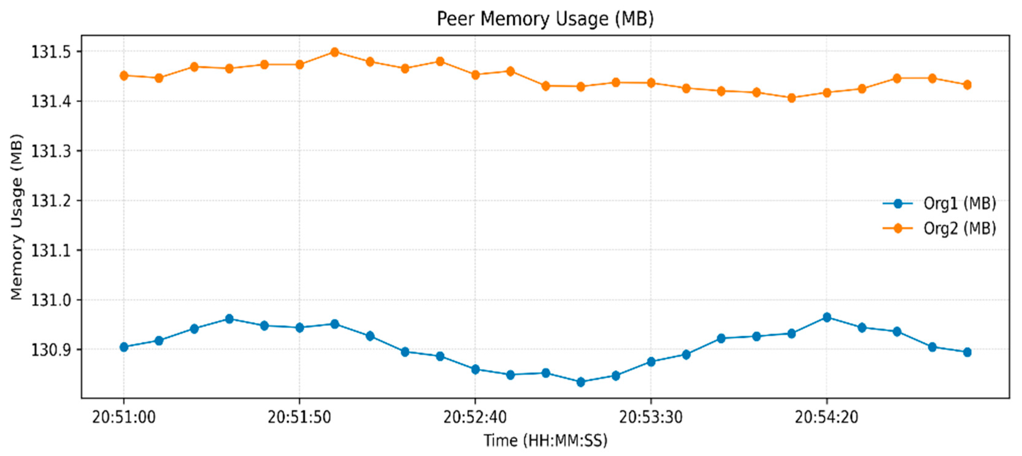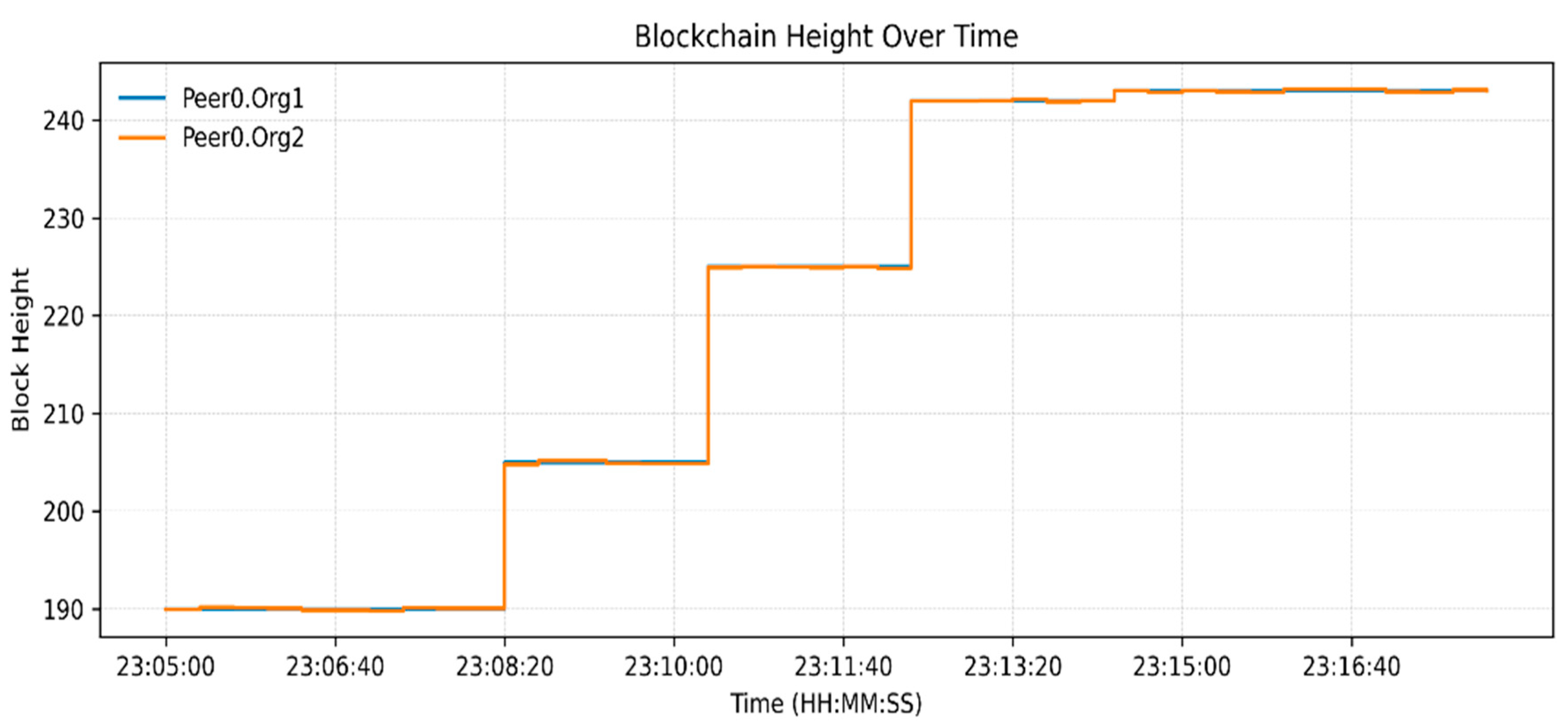 Table 3 indicates an increase in Blockchain height from 190 to 245 blocks and the peer ledgers were in tandem. Monitoring the operations of the orderer, 14 simultaneous requests were handled, which confirms the stable broadcast activities. CPU usage remained under 2.4% (