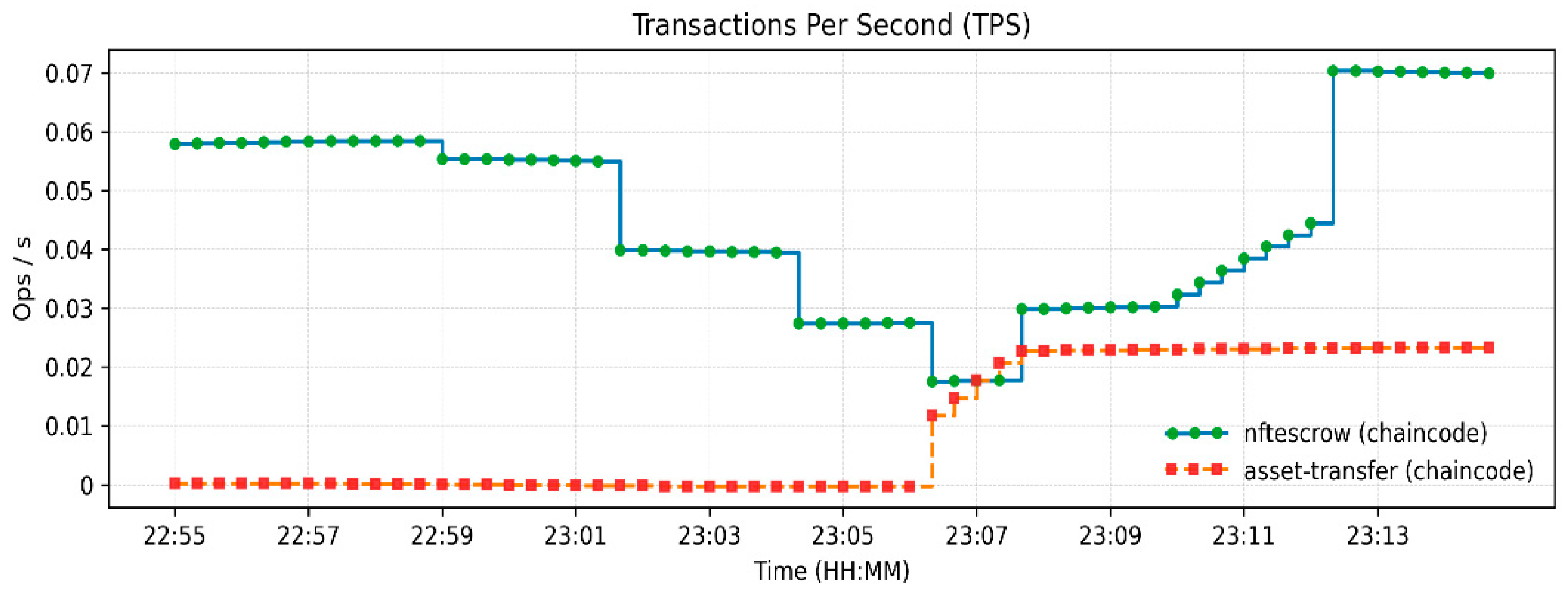Figure 5), respectively, which shows lightweight resource requirements and stable internal processes. Chaincode Latency remained at or below 0.0003 s, and assettransfer and nftescrow contracts all stabilized with warm-up, which were uniformly executed (