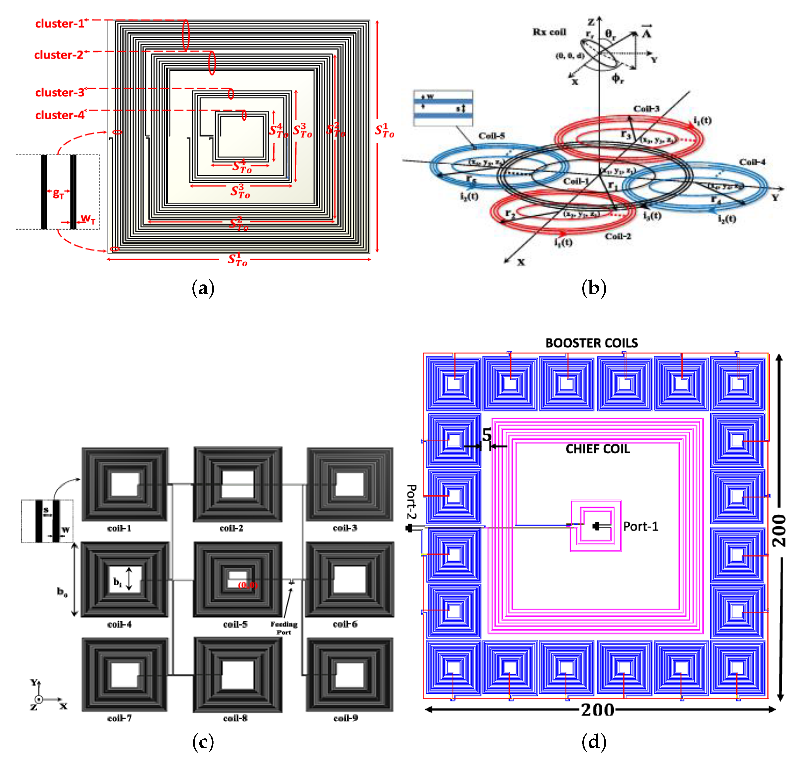 - Bharadwaj, A.; Srivastava, V.K.; Sharma, A.; Reddy, C.C. A Switchable Multicoil Antenna with Booster Coil to Improve Coverage in WPT Systems. IEEE Trans. Antennas Propag. 2022, 70, 2490–2498. [Google Scholar] [CrossRef]
