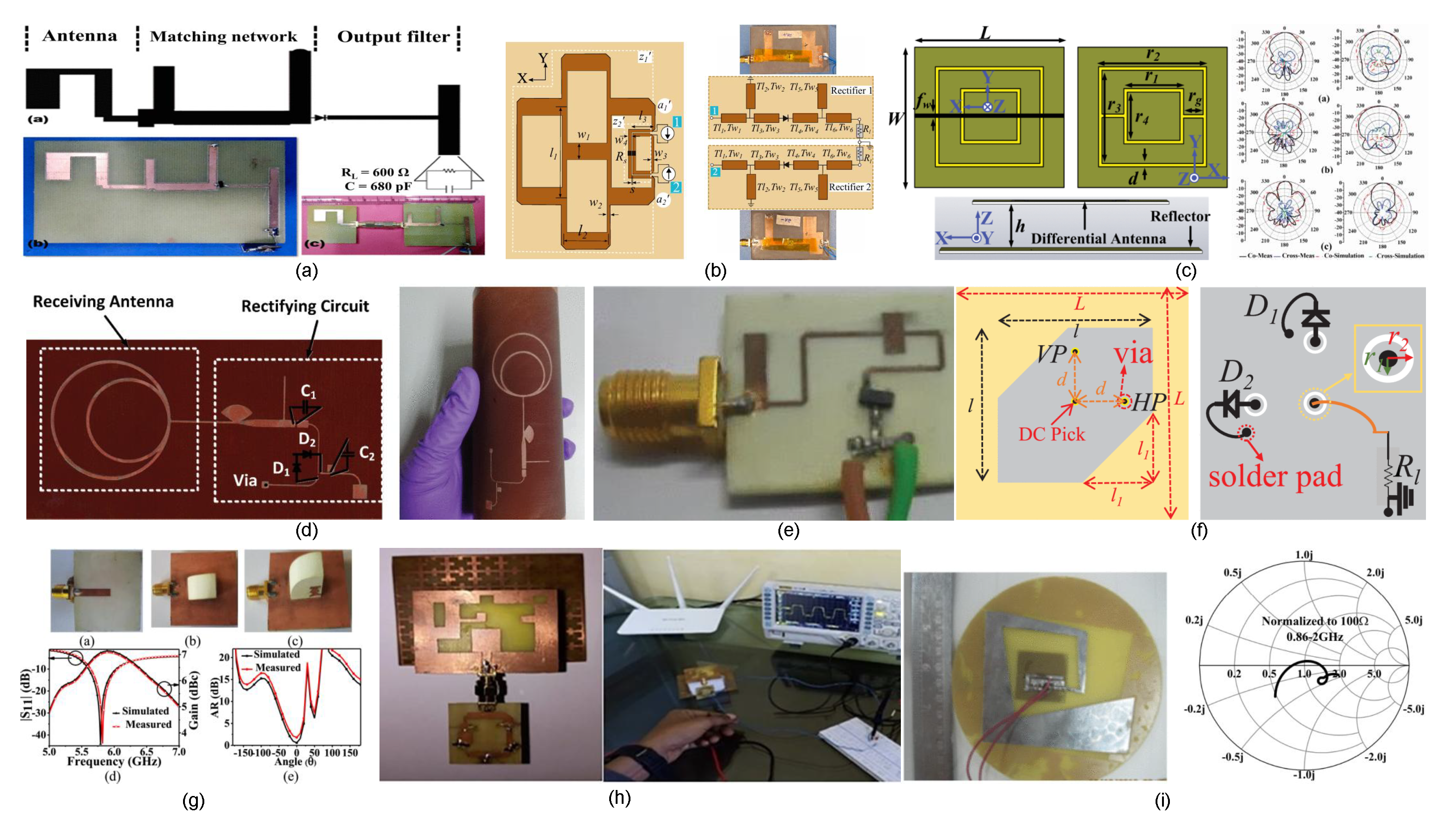 | Ref | Frequency Band(s) | Peak RF-DC Efficiency | Output Power/Volatge | Polarization | Key Innovation/Application |
