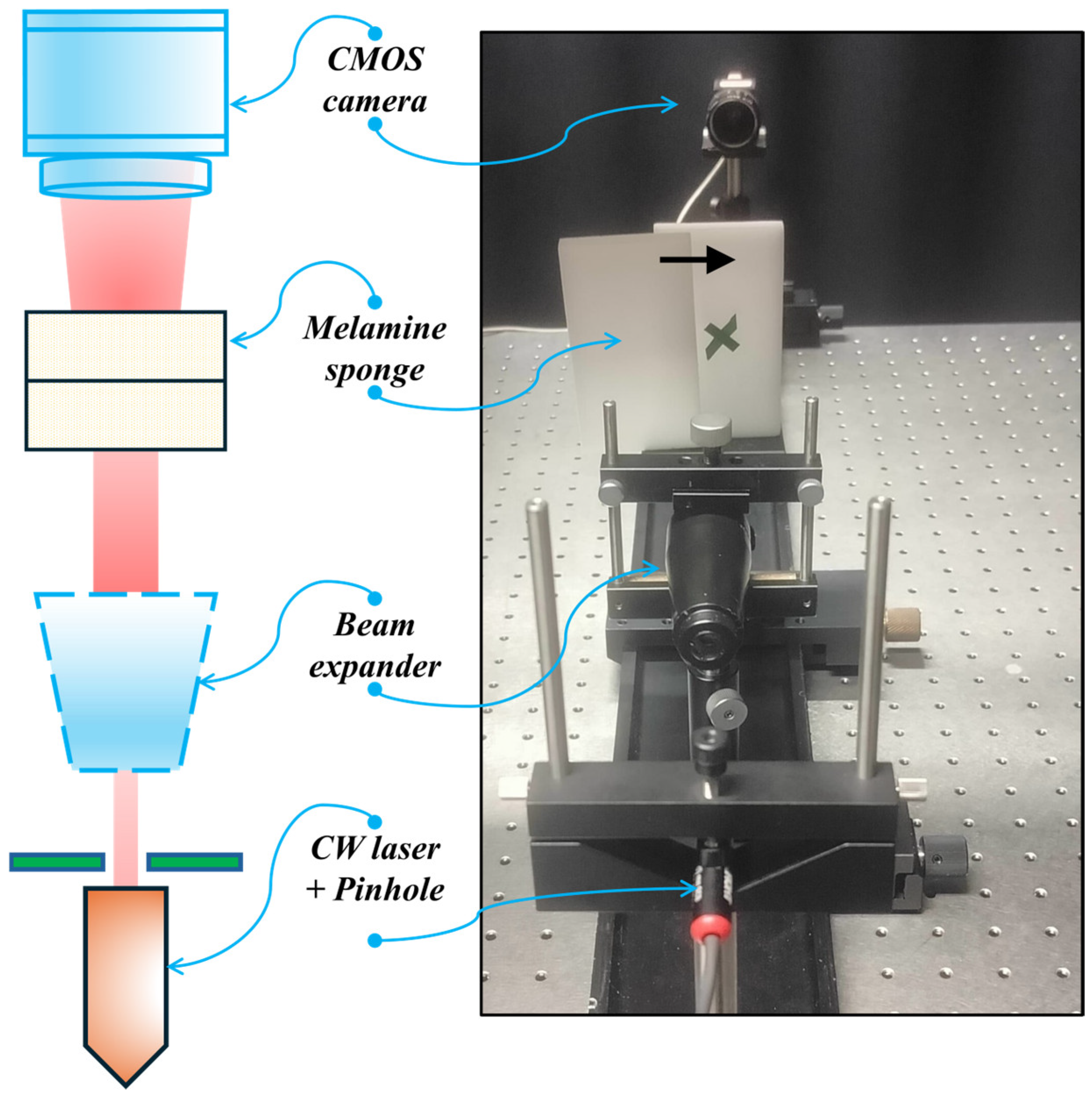 Figure 5. We use a CW laser source (THORLABS PL252) with a wavelength of 639 nm and an output power of 4.5 mW. The beam is expanded to a spot with a radius of 15 mm using a beam expander, after which it is incident on the melamine foam of 3 cm thickness, containing the anomaly at a depth of 1.5 cm.