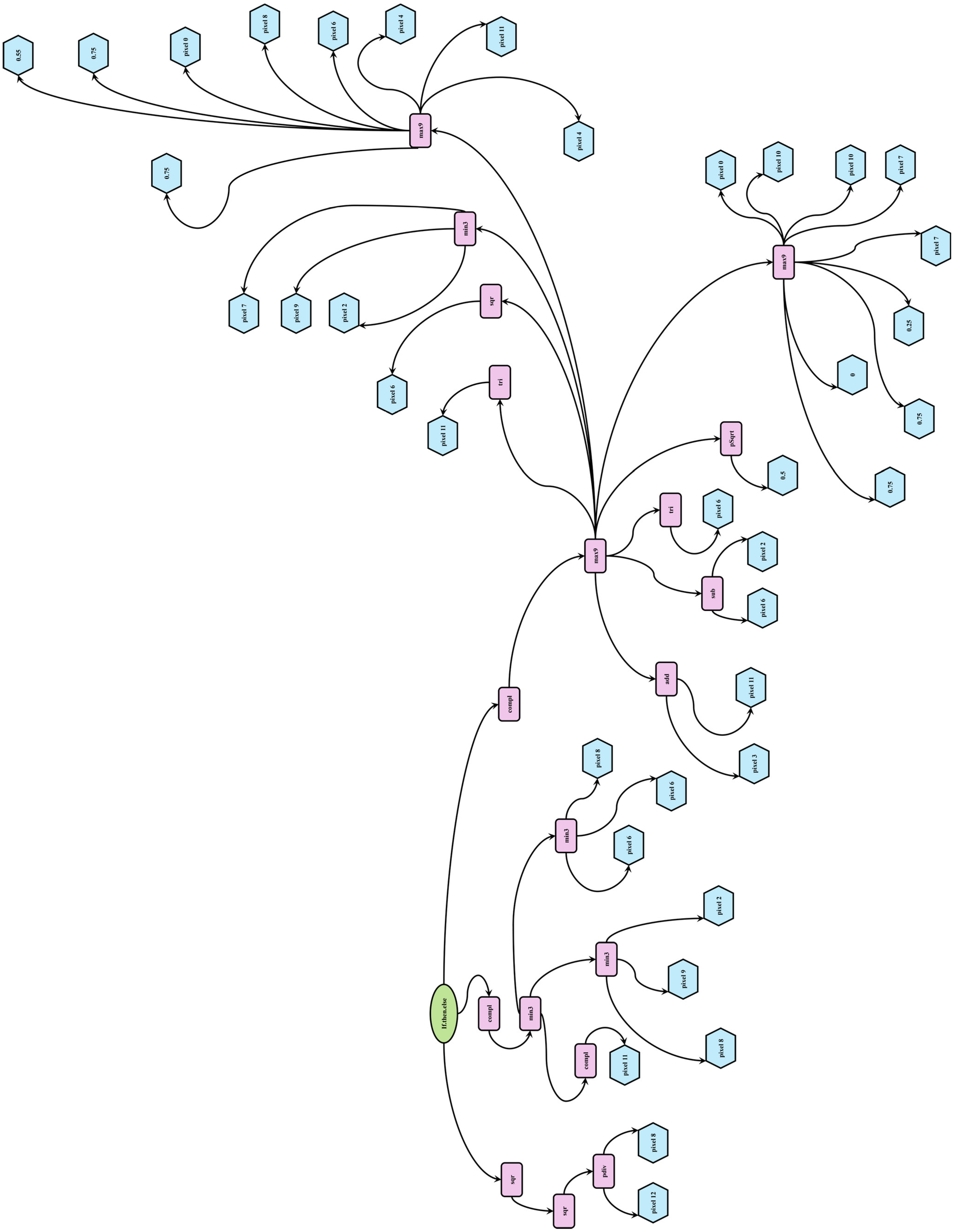 Figure 9, perform key transformations. Initially, functions like “min3” compute minimum values across several groups of pixels to identify the darkest regions within a local patch. These are combined with inverted signals from key pixels via the “Compl” (Complement) operator to form a dynamic threshold. This result is then inverted again to amplify areas that stand out from their surroundings. Operators such as “sqr” (Square) emphasize stronger signals and suppress weaker ones, “pDiv” (Protected Division) normalizes while avoiding divide-by-zero errors, and “max9” amplifies key variations. Additional arithmetic functions mix, scale, or reshape pixel values.