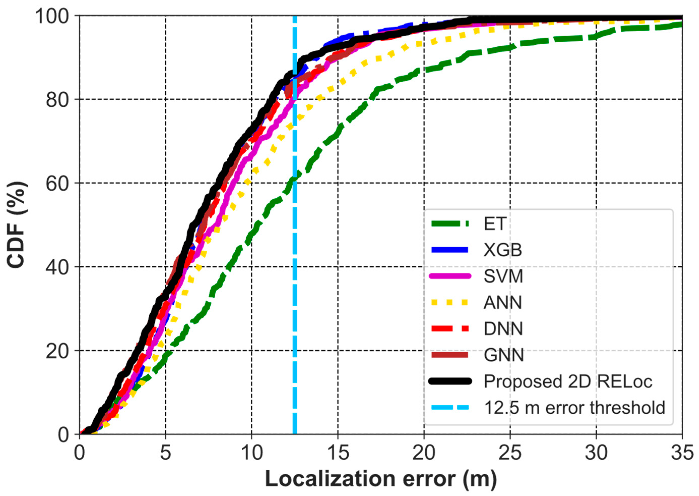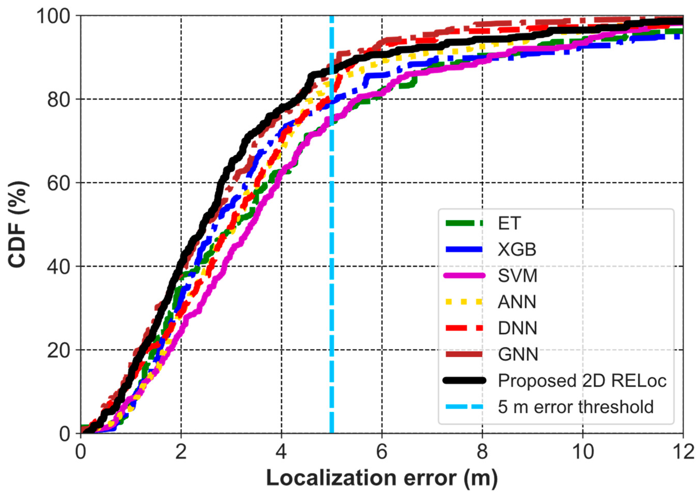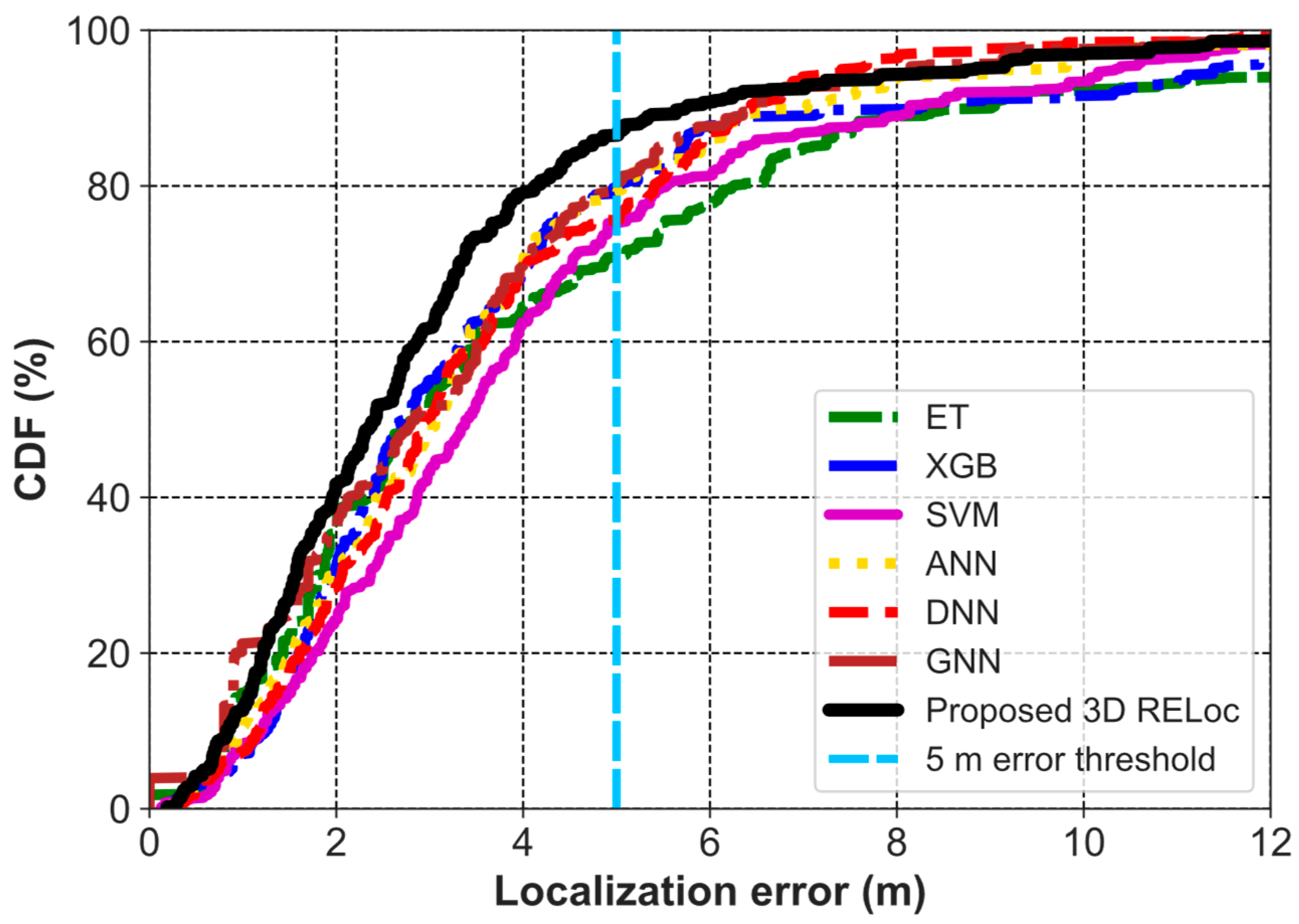 | Ref. | Method | MAE (m) | RMSE (m) | Ref. | Method | RMSE (m) | MLE (m) |