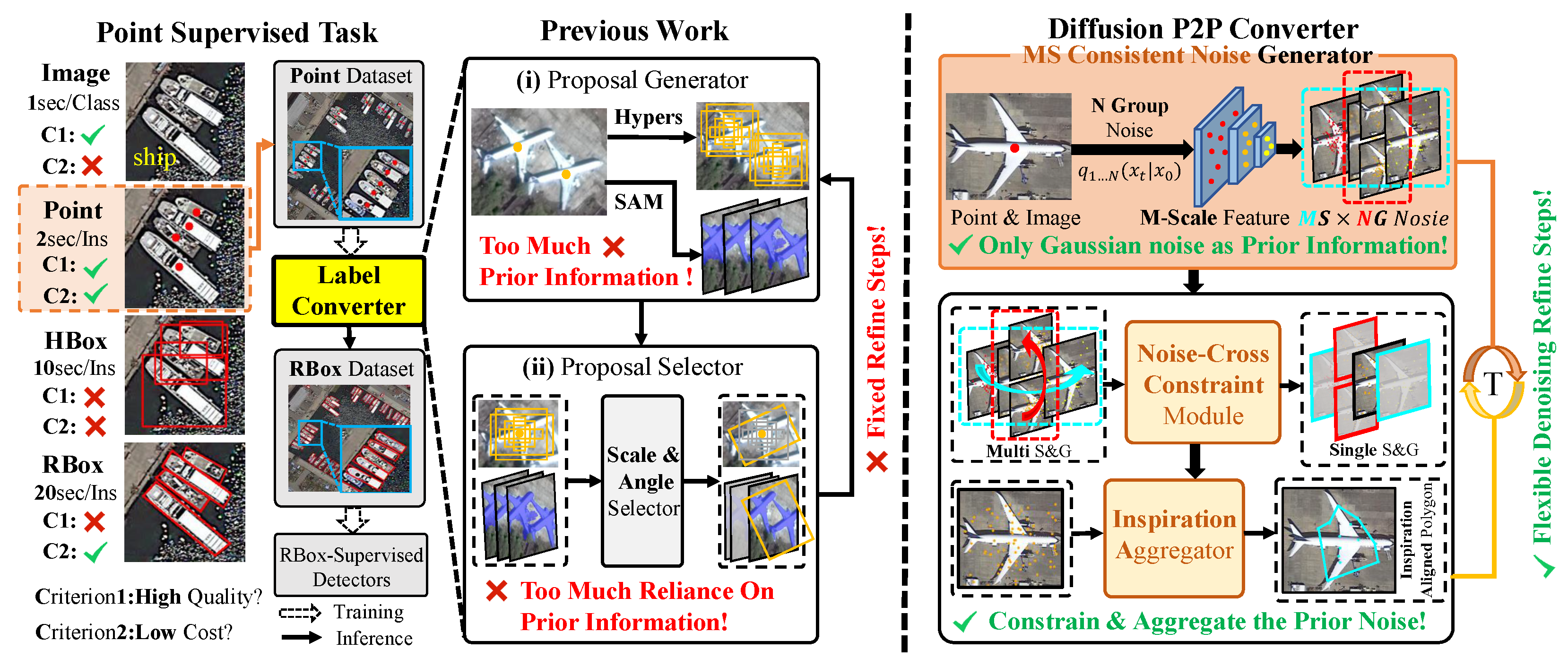 - Point Supervision: Point-level annotation provides stronger prior information regarding the object location compared to image-level annotation, while adding relatively minimal annotation costs. Additionally, the cost of point-level annotation is relatively low when compared to other instance-level annotations, such as horizontal or rotated boxes. In the field of oriented object detection, point-level supervision remains a relatively new innovation. Current research primarily focuses on designing a label converter that can transform point annotations into RBBs. PointOBB enhances the MIL network’s ability to perceive the scale and orientation of objects by scaling and rotating the original image, while P2RBOX introduces SAM as a mask generator and designs an inspector module to select high-quality masks for generating RBBs. Label converters can effectively be integrated with the now mature RBox-supervised methods. However, existing label converters heavily rely on the quality of prior information and multi-stage progressive refinement.