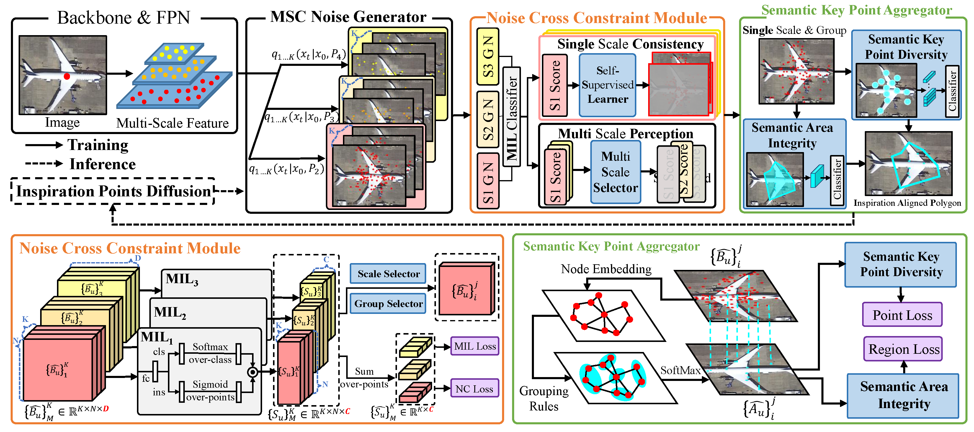 - The DiffusionPoint2Polygon Network presented in this paper not only breaks away from the dependency on complex prior information through the multi-scale consistent noise point generation module during the diffusion process, but also incorporates a Noise Cross-Constraint module during the denoising process to perceive noise sampling points within a range of objects of various sizes and shapes. Subsequently, using the Semantic Key Point Aggregator, it generates pseudo-RBBs based on convex hulls formed by inspiration sampling points that indicate semantically important parts of the object.