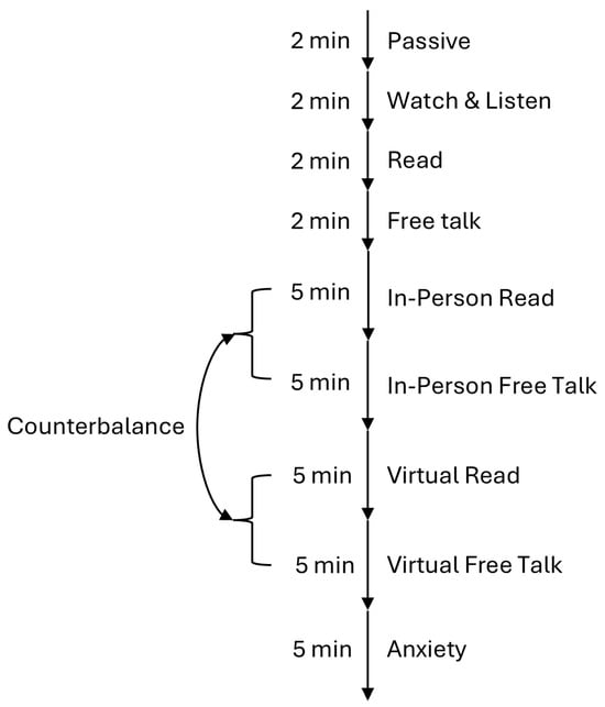 - Dialogue, 5 min each: The dialogues took place between an experimenter and the participant, either in-person or virtually. The order of these two conditions alternated for each participant to avoid any temporal effects and always started with the reading task followed by free talk.