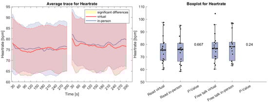 (Left side): Average trace and standard deviation of heart rate during the reading and free-talk tasks. The in-person trace is shown in blue, while the virtual trace is shown in red. The blue and red shaded areas represent the standard deviation for in-person and virtual sessions, respectively. Yellow shading, if visible, indicates significant differences between the two conditions. (Right side): Box plot for heart rate averaged over each task for virtual and in-person condition with a p-value for a Wilcoxon signed-rank test.