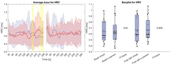 (Left side): Average trace and standard deviation of heart rate variability during the reading and free-talk tasks. The in-person trace is shown in blue, while the virtual trace is shown in red. The blue and red shaded areas represent the standard deviation for in-person and virtual sessions, respectively. Yellow shading, if visible, indicates significant differences between the two conditions. (Right side): Box plot for heart rate variability averaged over each task for virtual and in-person condition with a p-value for a Wilcoxon signed-rank test.