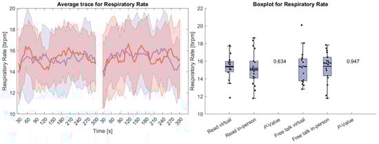 (Left side): Average trace and standard deviation of respiratory rate during the reading and free-talk tasks. The in-person trace is shown in blue, while the virtual trace is shown in red. The blue and red shaded areas represent the standard deviation for in-person and virtual sessions, respectively. Yellow shading, if visible, indicates significant differences between the two conditions. (Right side): Box plot for the respiratory rate averaged over each task for virtual and in-person condition with a p-value for a Wilcoxon signed-rank test.