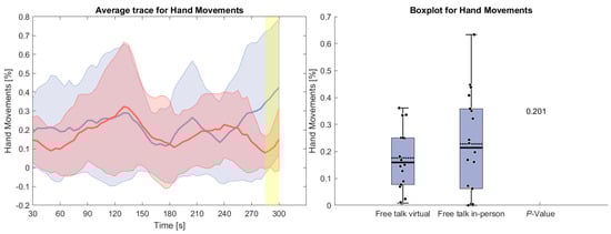 (Left side): Average trace and standard deviation of counted hand and arm movements during the reading and free-talk tasks. The in-person trace is shown in blue, while the virtual trace is shown in red. The blue and red shaded areas represent the standard deviation for in-person and virtual sessions, respectively. Yellow shading, if visible, indicates significant differences between the two conditions. (Right side): Box plot for counted hand and arm movements averaged over each task for virtual and in-person condition with a p-value for a Wilcoxon signed-rank test.