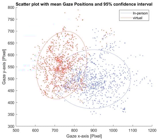 This pattern is further illustrated in Figure 8, which shows a scatter plot of average eye gaze positions for each window and participant. The ellipses represent the 95% confidence interval for each condition. The in-person condition shows a wider spread in average gaze position along the horizontal axis.