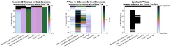 Finally, Figure 9 presents the PSD results for head movements in three subplots. The first plot shows the normalized difference in PSD between the in-person and virtual conditions during the free-talk task. Head acceleration in the right/left and up/down directions, look similar as they show larger power for the in-person condition for low-frequency areas (up to 7 Hz and 5 Hz respectively) and then a lower power for higher frequencies. Head Acceleration Back/Forward shows the reverse with lower Power for 0–2 Hz and higher Power for higher Frequencies. The angular velocities show a similar pattern. Roll and Pitch show higher power for the in-person condition up to 2 Hz and lower power above, while Yaw show lower the exact opposite. The second plot displays the p-values for these differences, calculated using the Wilcoxon signed-rank test with Benjamini–Hochberg correction. The third plot highlights the significant p-values for easier identification. Nearly all signals showed significant differences, except for very low-frequency components of back/forward and Yaw (0 Hz), head acceleration in the up/down direction above 10 Hz, and head acceleration in the back/forward direction between 20 and 30 Hz.