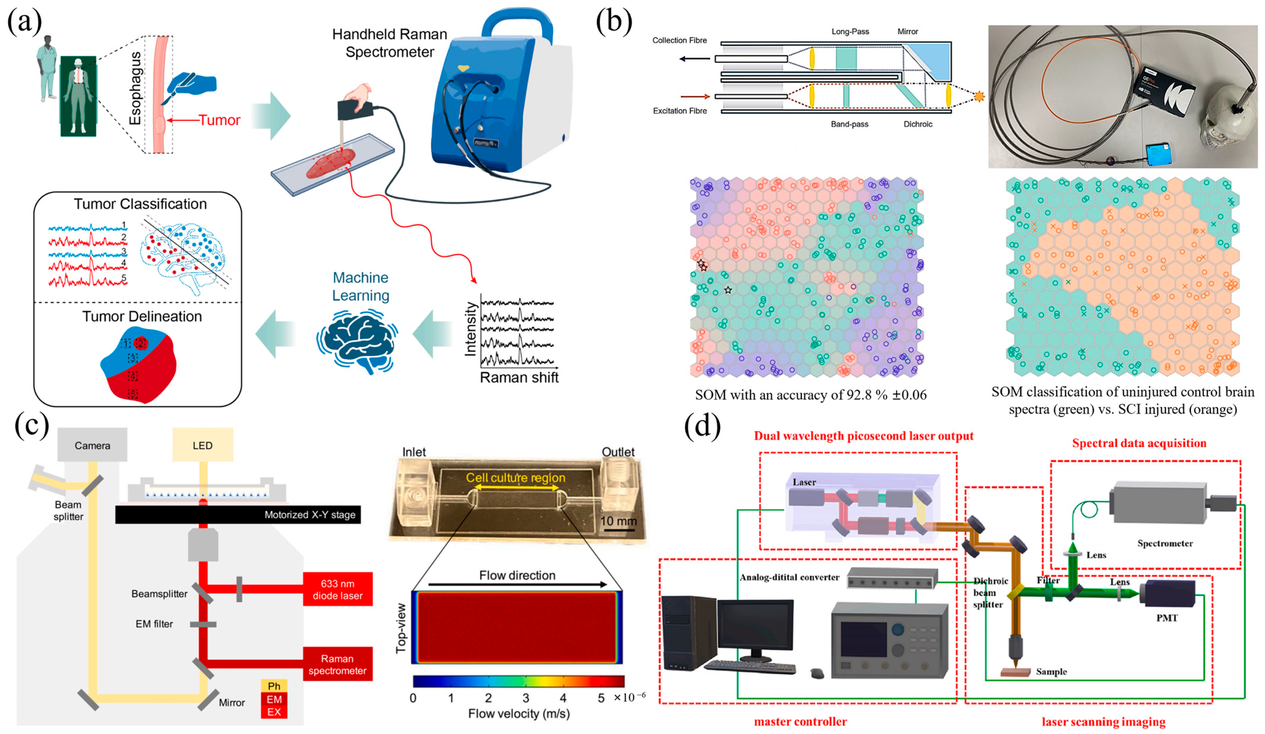 - Yang, J.Q.; Xu, P.; Wu, S.Y.; Chen, Z.; Fang, S.Y.; Xiao, H.B.; Hu, F.Q.; Jiang, L.Y.; Wang, L.; Mo, B.; et al. Raman spectroscopy for esophageal tumor diagnosis and delineation using machine learning and the portable Raman spectrometer. Spectroc. Acta Part A Mol. Biomol. Spectr. 2024, 317, 124461. [Google Scholar] [CrossRef] [PubMed]