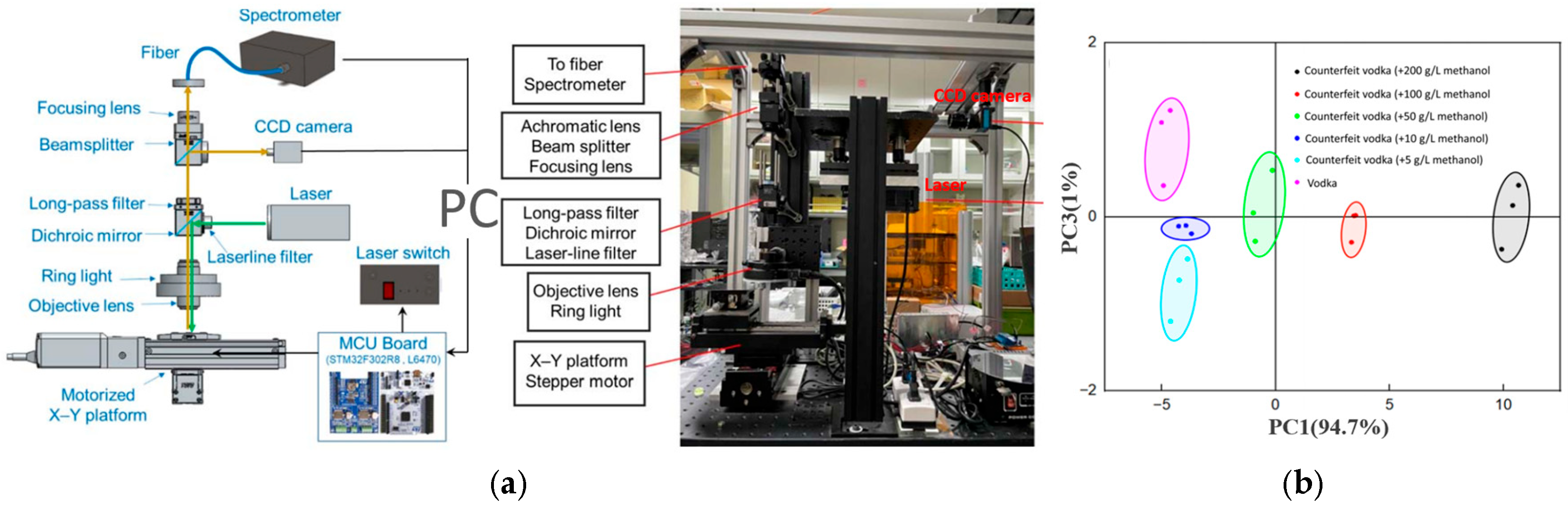 - Chi, H.W.; Hu, S.W.; Lin, D.Z. Development of an automated Raman system and use of principal component analysis to classify real and counterfeit liquors. RSC Adv. 2023, 13, 33288–33293. [Google Scholar] [CrossRef]