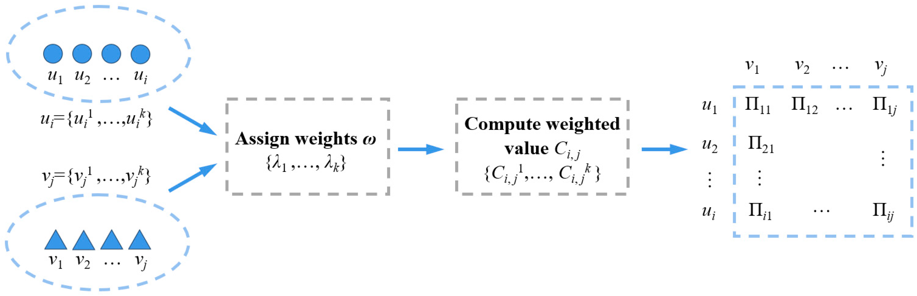 G, given sets and , the weighted value between any two vertices and is calculated as: Definition 3: