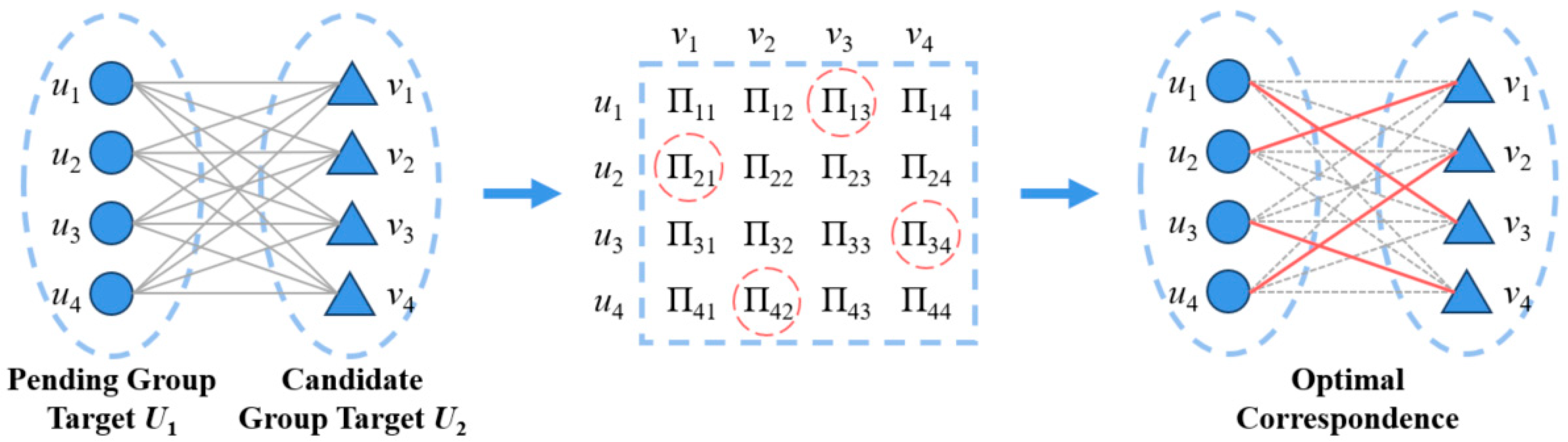 The essence of the group target association problem lies in establishing an optimal matching relationship between the pending group targets and the candidate group targets. Therefore, it can be modeled as a typical bipartite graph matching problem. In this context, one set of nodes represents the pending group targets, while the other set represents the candidate group targets. The weights of the edges in the graph represent the similarity or association cost between group targets.