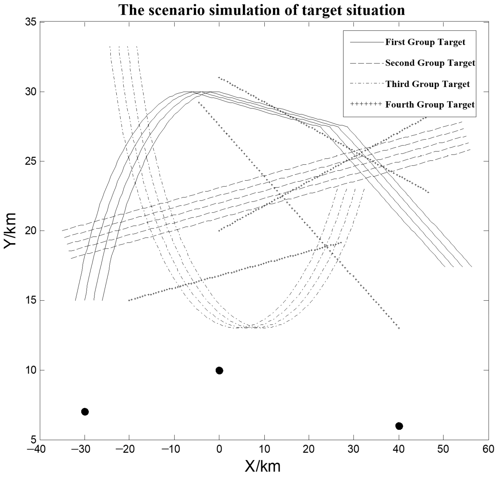 Figure 6, several groups exhibit nonlinear patterns such as curved paths, turning maneuvers, and trajectory intersections. Some groups also display partial overlaps and varying motion headings, introducing complex interactions commonly encountered in realistic multi-sensor multi-target tracking scenarios. The initial spacing between adjacent targets is set to 1.4 km. This simulation setting is intentionally designed to reflect the multi-radar sensing conditions considered in this work, in which heterogeneous systematic biases, asynchronous measurements, and non-collinear sensor placements play a central role in shaping group-association behavior.