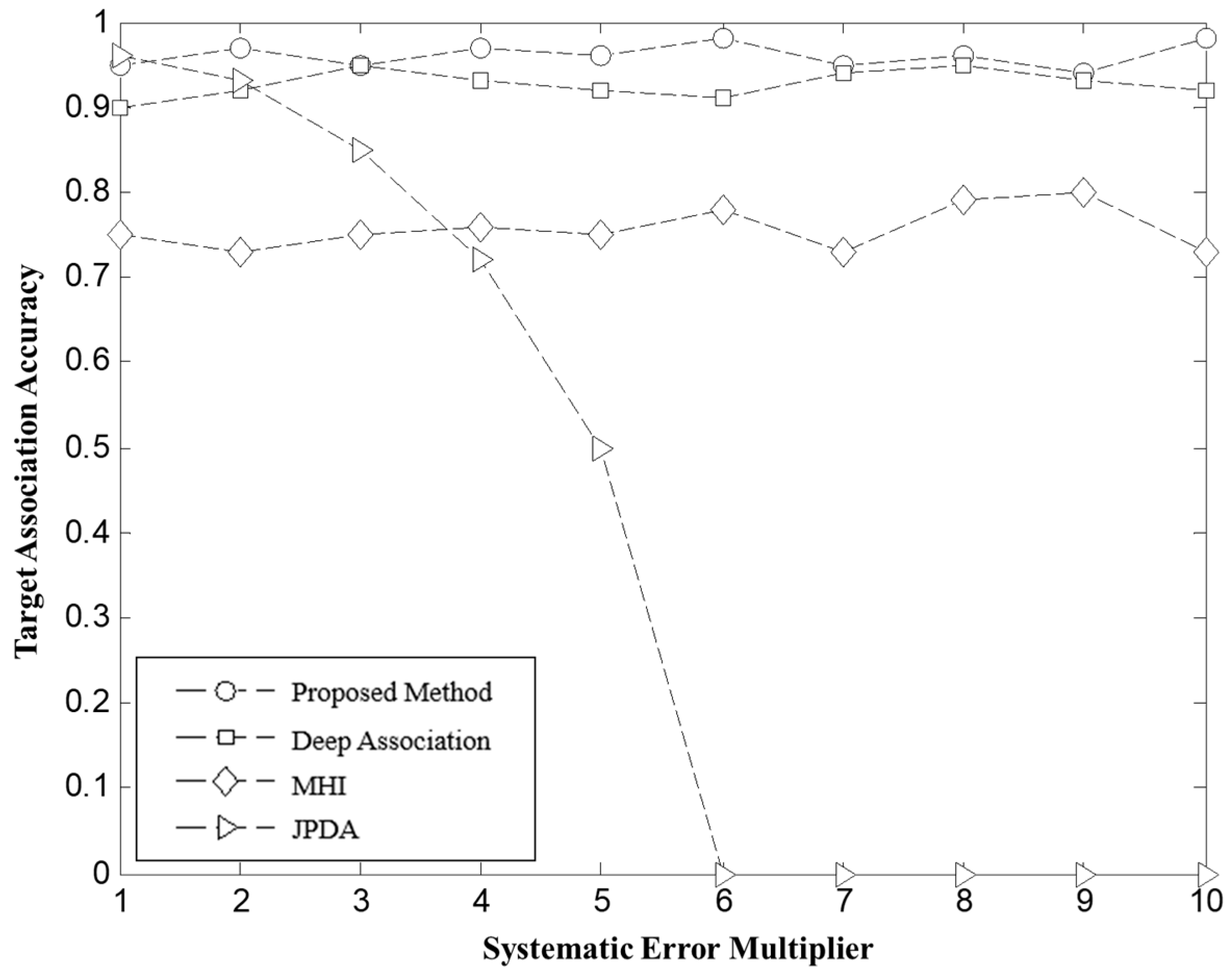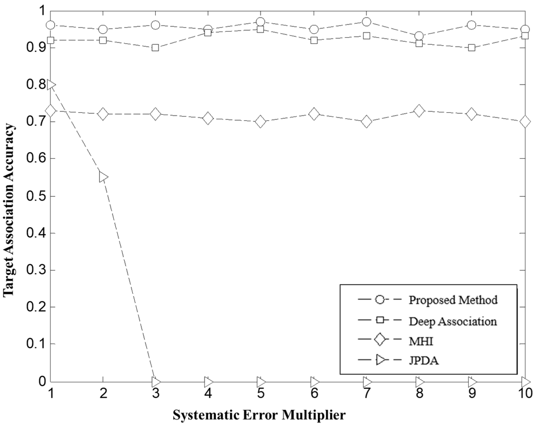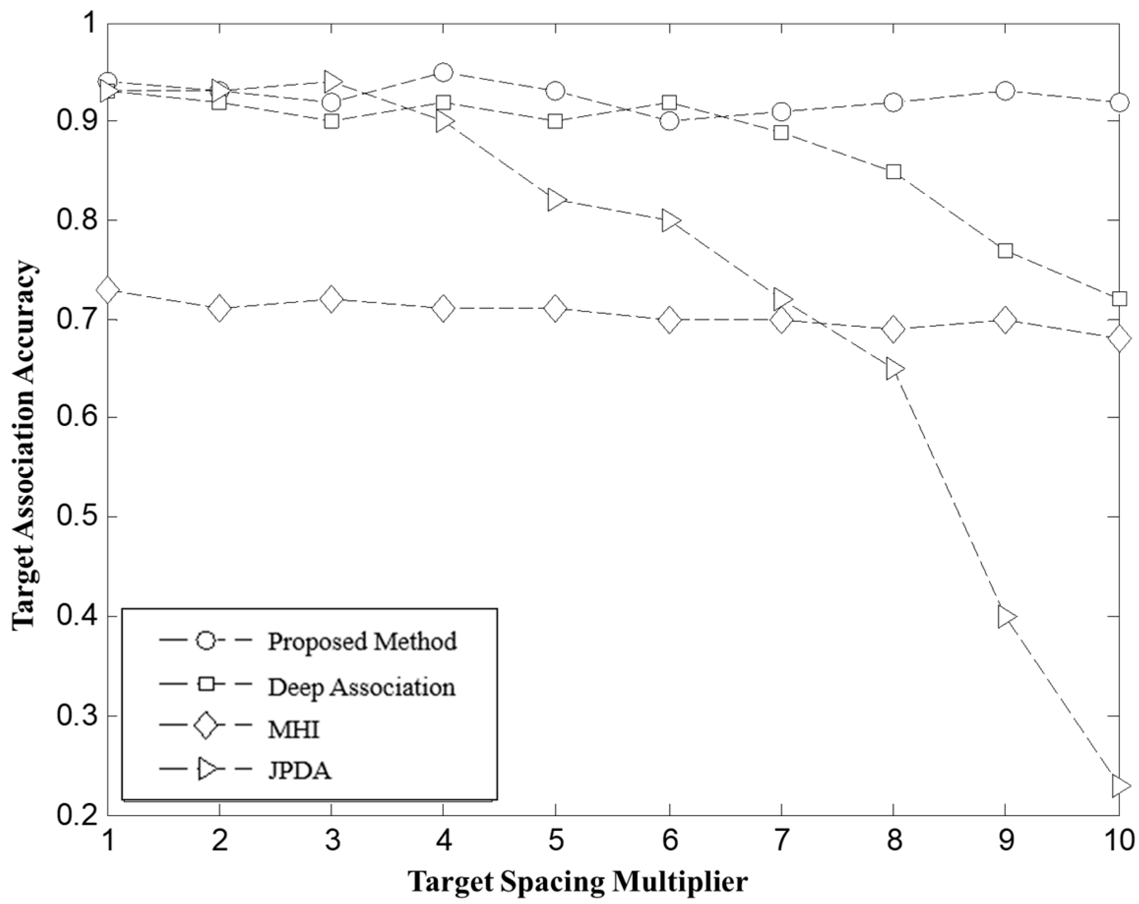 Figure 9, with the continuous decrease in target flight separation, the influence of sensor random errors becomes more pronounced, amplifying the uncertainty in target association. When the amplitude of random errors approaches the actual separation distance between targets, the JPDA’s association accuracy plummets from over 90% to around 20%. This is due to the fact that in small separation conditions, random errors obscure the true motion trajectory of the targets, leading to a significant number of incorrect associations. The denser the target distribution, the higher the error rate. Although the MHI still maintains an association accuracy above 70% in this environment, it shows a slight decline compared to other experimental conditions. Deep Association also experiences a decrease in association accuracy to around 70% due to the accumulation of errors from previous steps. In contrast, the global optimal matching method based on target bipartite graphs proposed in this paper effectively decouples and globally optimizes the target frames, making it more robust to random error interference in densely clustered environments. As a result, the association accuracy remains stable at over 90%, demonstrating high universality and reliability.