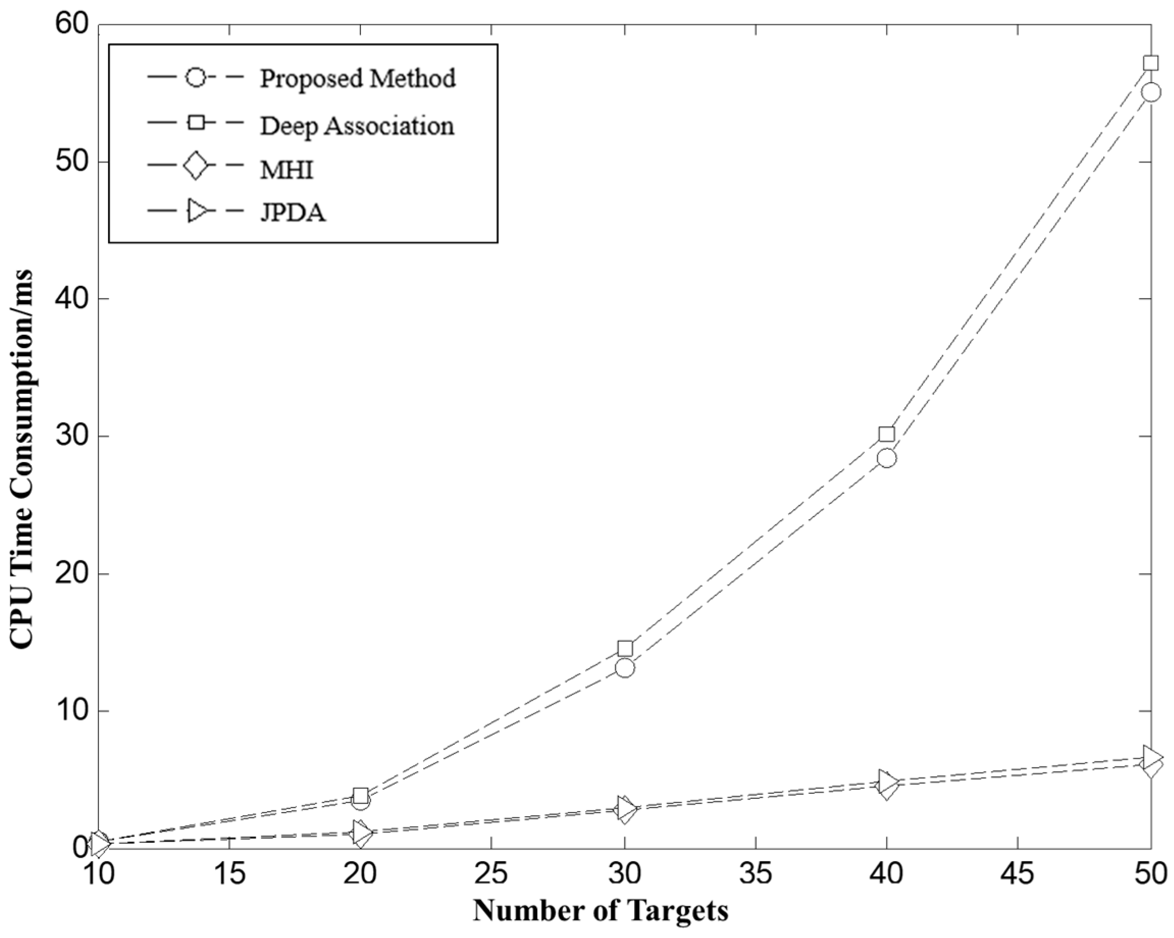 Figure 10 shows the average CPU runtime of the four methods under different target quantities. The experimental results indicate that as the number of targets increases, the runtime for all methods shows a noticeable upward trend. Among them, Deep Association and the one proposed in this paper had relatively high computation times, mainly due to the global optimization strategies they employed, resulting in a worst-case time complexity of