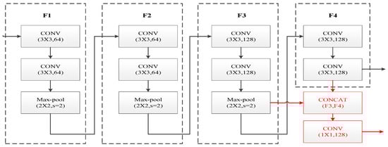 To simultaneously capture local details and global semantics of the image, the improved encoder is designed with two parallel feature extraction branches, which output feature maps of the third layer () and the fourth layer (), respectively, forming a multi-scale information foundation. The third-layer branch focuses on high-frequency detailed information such as local textures and edges of the image. After the input image of size is processed by the first two convolutional layers, the feature map is output, where each spatial position corresponds to a 128-dimensional feature vector, with the expression as follows: