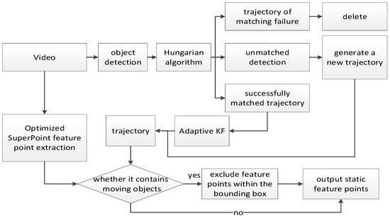The traditional SORT algorithm achieves multi-target tracking through target detection, Kalman filter prediction, and Hungarian matching, but it has two limitations in dynamic scenarios: first, it uses a standard Kalman filter, which can only handle linear systems and cannot adapt to the nonlinear motion of dynamic objects; second, it employs a fixed noise covariance model, making it difficult to cope with disturbances such as sudden changes in illumination and target occlusion, resulting in tracking drift. To address these issues, this paper proposes the ASORT algorithm, which adapts to nonlinear motion through KF, enhances robustness via adaptive noise adjustment, efficiently completes target detection and tracking, and combines with global feature points to achieve accurate filtering of dynamic feature points. The complete process of dynamic feature point elimination is shown in Figure 4.