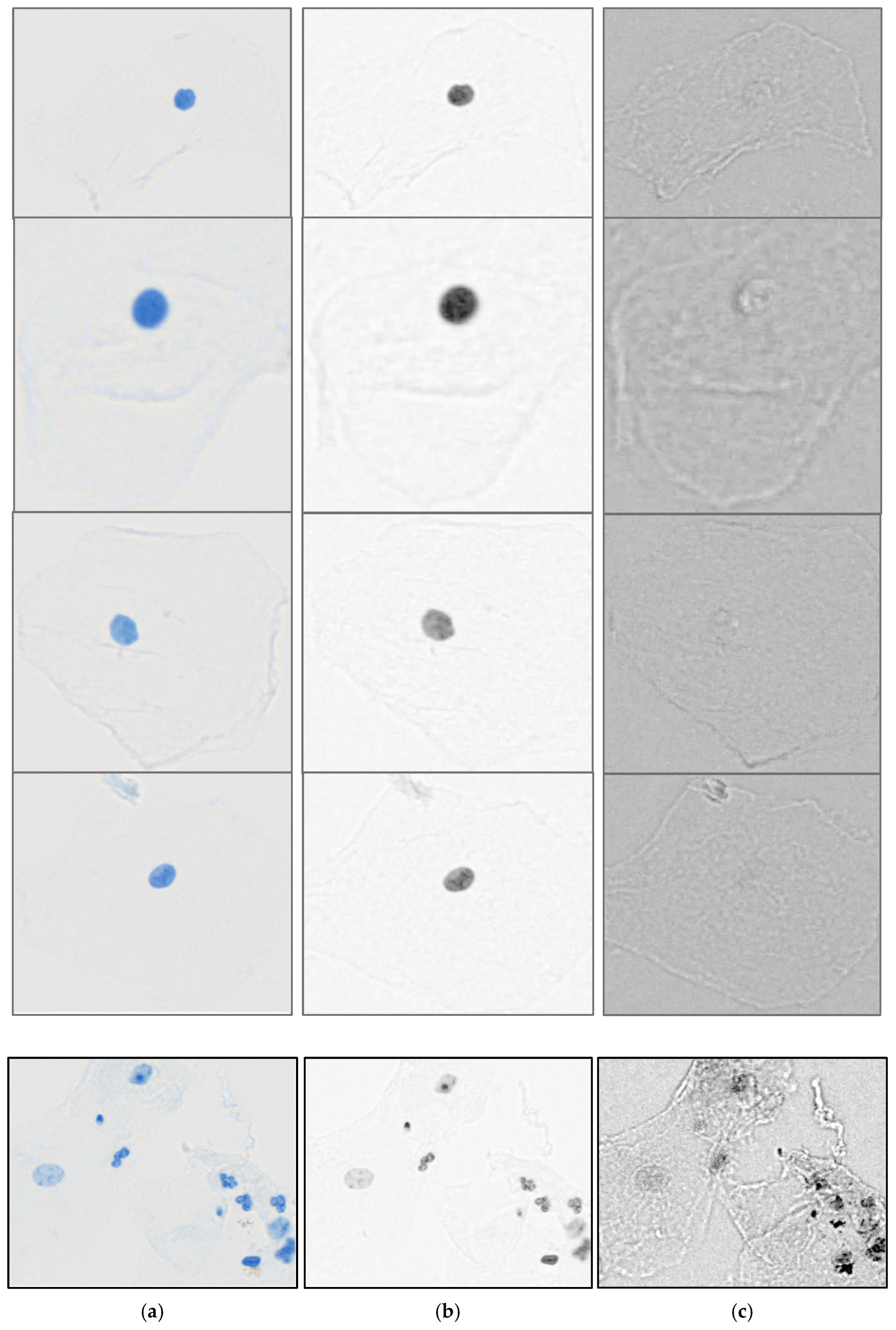 20]. In addition to improving ploidy analysis, by removing the background noise and refraction effects in the image, it appears to effectively enhance texture features discriminating ability. While the results here are based on hyperspectral images taken over 16 wavelengths as a proof of concept, the same process appears to work with only three spectral bands (RGB) as seen in