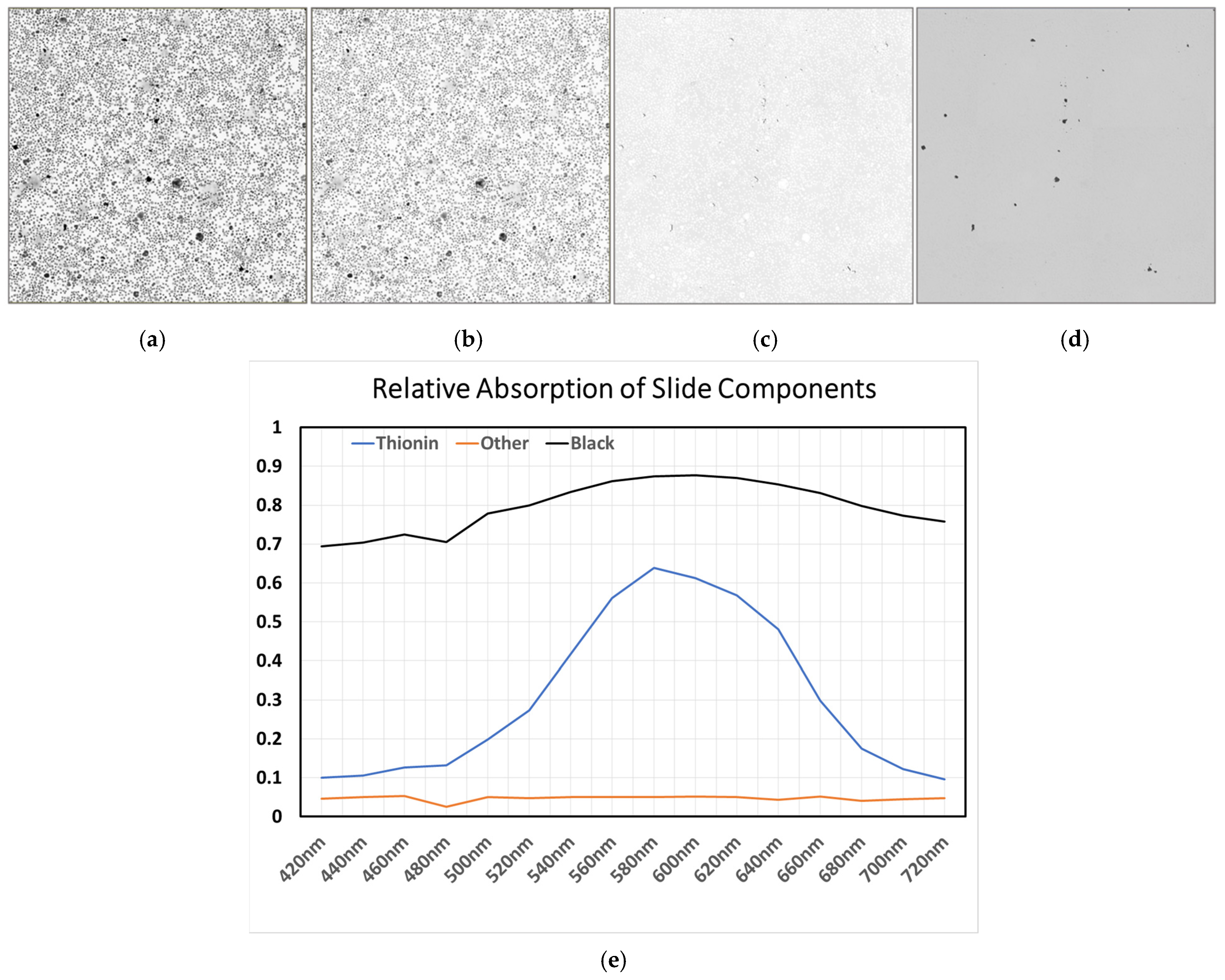 Spectral unmixing refers to the process of computationally unmixing stains to determine the concentration of the stain at every pixel in a selected area using the absorption spectra of each stain in the image. Thionin exhibits a distinctive and sharply peaked (600 nm) absorption spectra when compared to other non-specific absorbers or refraction effects observed within pathology slides (