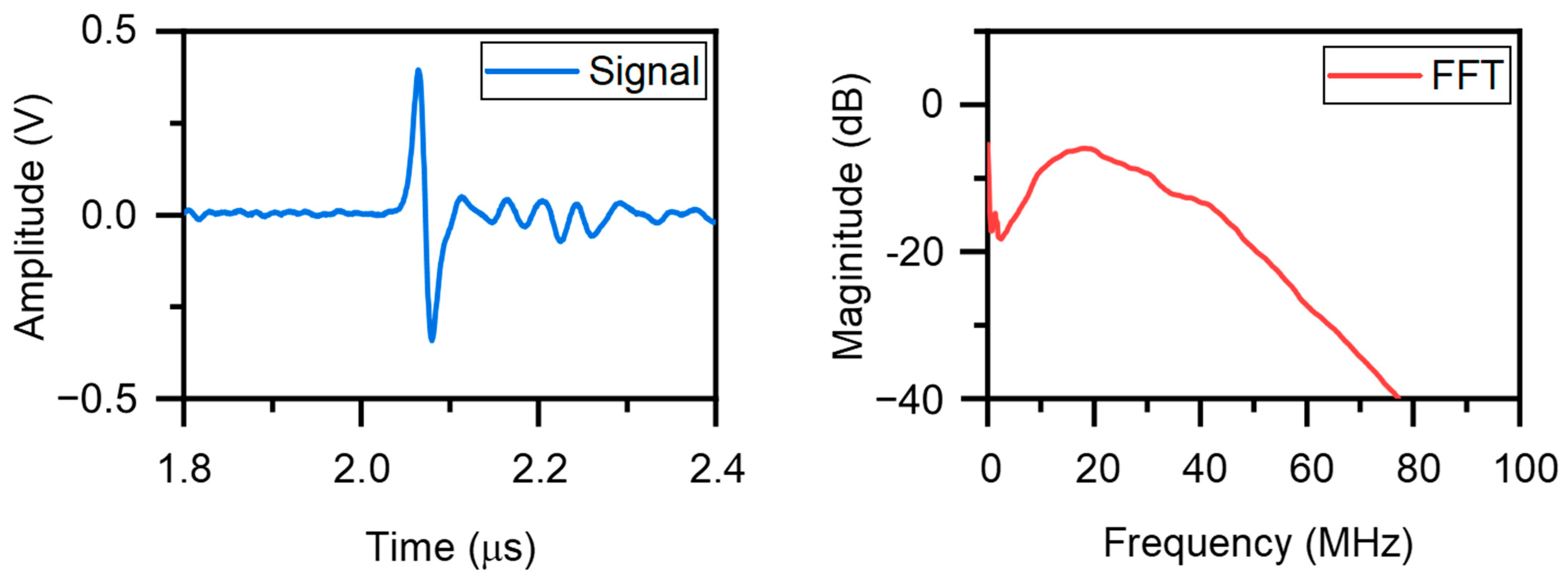 Figure 4 shows an illustrative example of the ultrasonic signals excited by polydimethylsiloxane (PDMS) and graphene and their spectra. The graphene-enhanced composite exhibits higher peak amplitude and broader bandwidth compared to pure PDMS, illustrating the improved photothermal conversion efficiency enabled by carbon-based nanofillers.