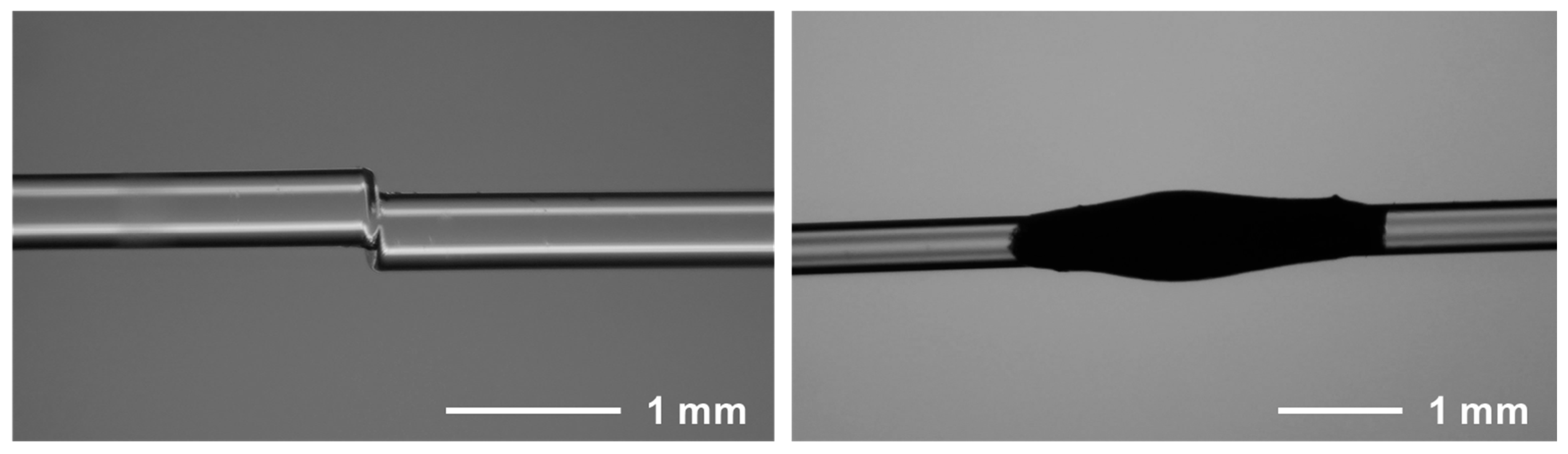 77]. The device used a gold-coated multimode fiber for ultrasonic generation and integrated both a FPI and a FBG within a second fiber for detection. By bonding both fibers to a metal pipe (1.5 cm long, 4.14 cm in diameter), the system successfully detected two 0.5 mm-wide cracks.