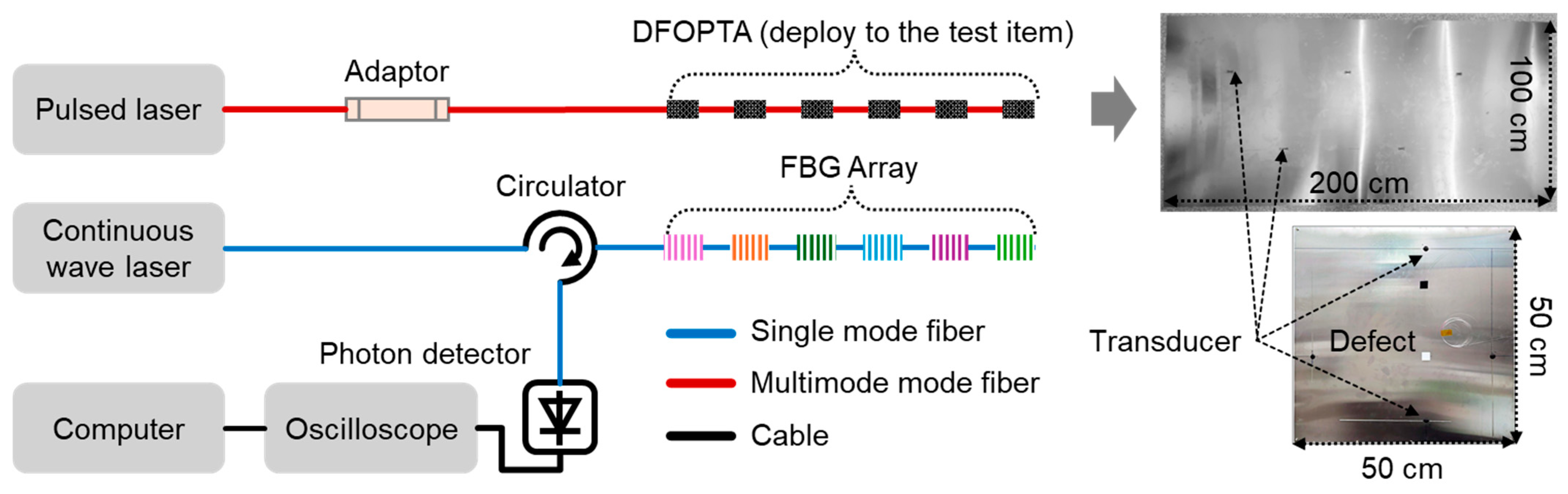 Table 5 summarizes recent methods and photoacoustic materials employed in single point FOPTs. In recent years, significant progress has been made in the development of FOPTs, as exemplified by the diverse range of structures and mechanisms presented. Building on the foundational side-polishing technique, researchers have innovated with advanced functional materials—such as MXene-PDMS for efficient energy conversion—and engineered structures like TFBGs, LPFGs, and CPCFs to achieve multi-point excitation and side-wall integration. Novel physical mechanisms, including thermo-cavitation, have been explored to generate broadband ultrasonic. These advancements have collectively enabled the creation of transducers with enhanced functionalities, such as operation in extreme environments, large-area coverage, and integrated sensing capabilities, thereby significantly advancing the field toward practical, high-performance distributed photoacoustic NDT systems.
