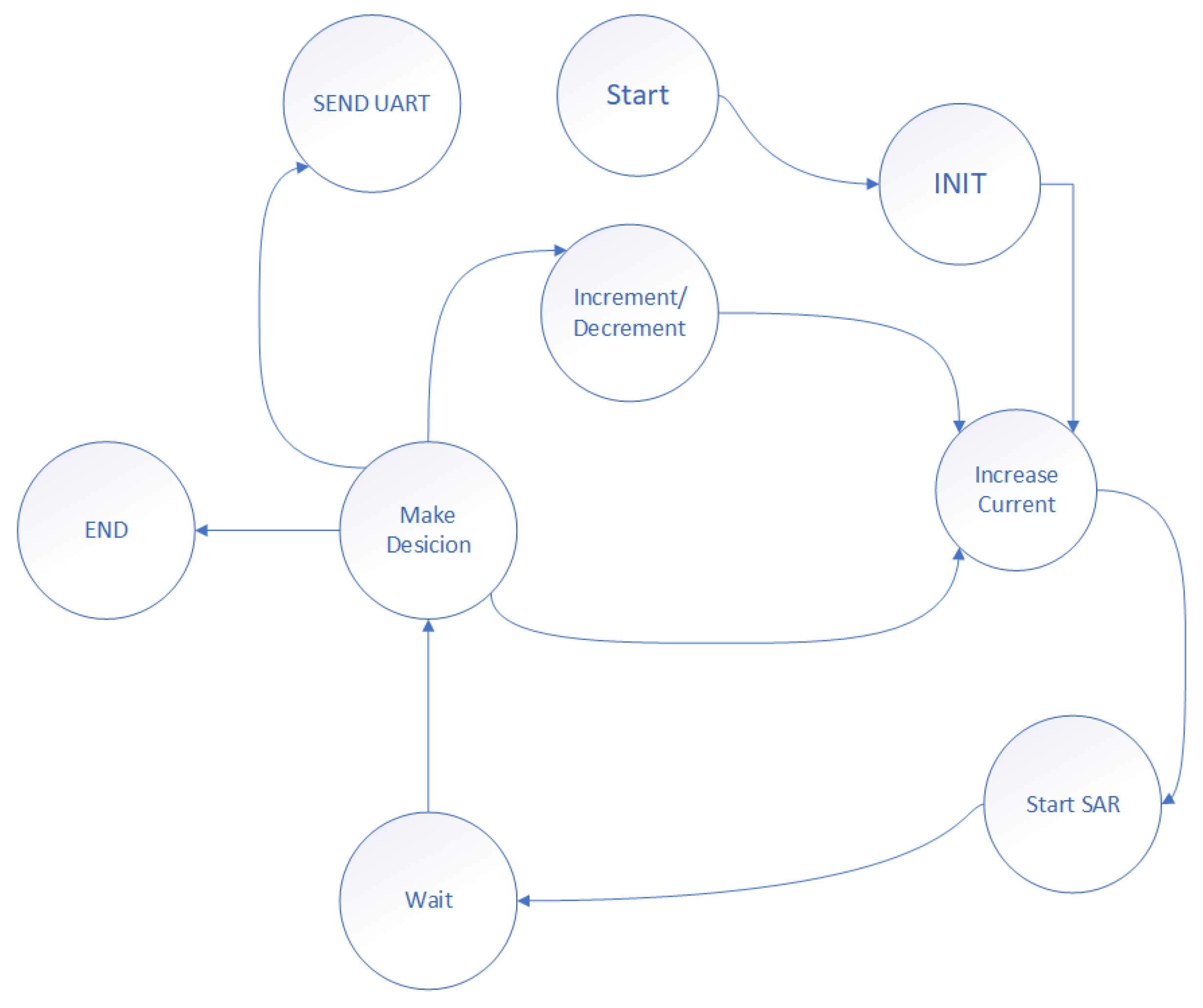 The FSM begins in the Start state and transitions to an INIT state, where all internal variables and control signals are initialized. It then proceeds to the Increase Current state, incrementally stepping the input current through a predefined set of values. Following this, the FSM transitions to the Start SAR state, where it initiates a SAR conversion to digitize the sensor’s analog output.