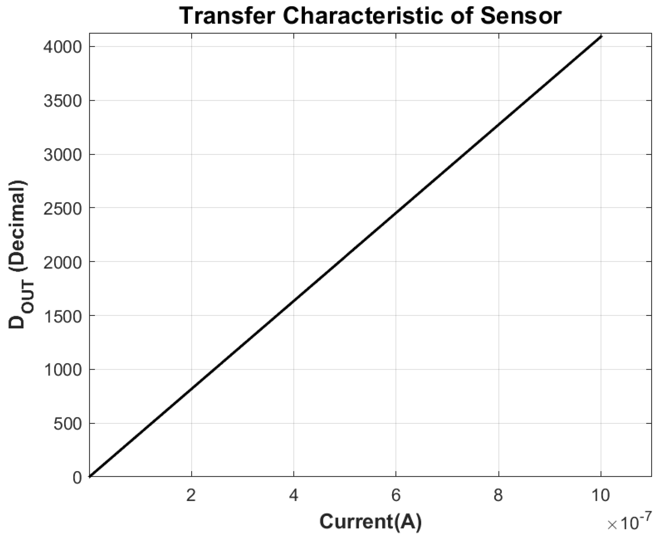Figure 6, clearly showing transitions of code with increasing current. The output codes exhibit a monotonic and highly linear response with respect to the applied input current, confirming the accuracy of the current-to-voltage conversion and embedded SAR digitization process.