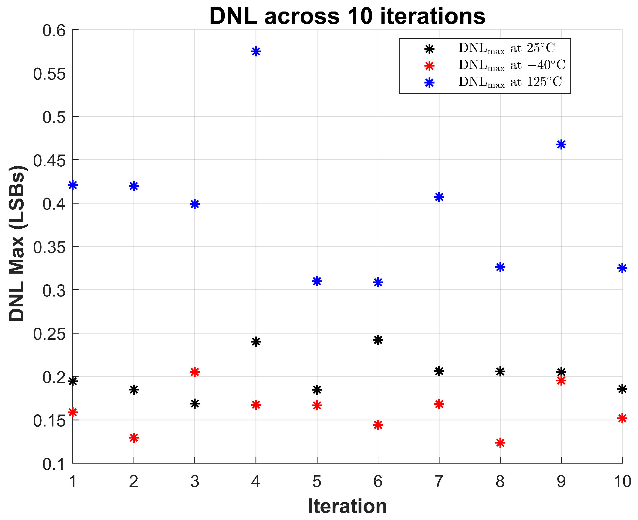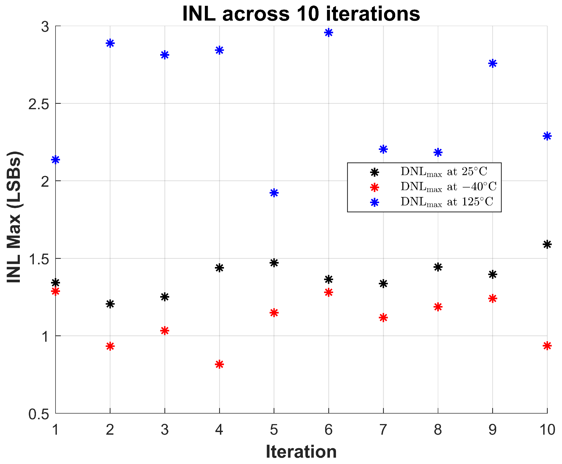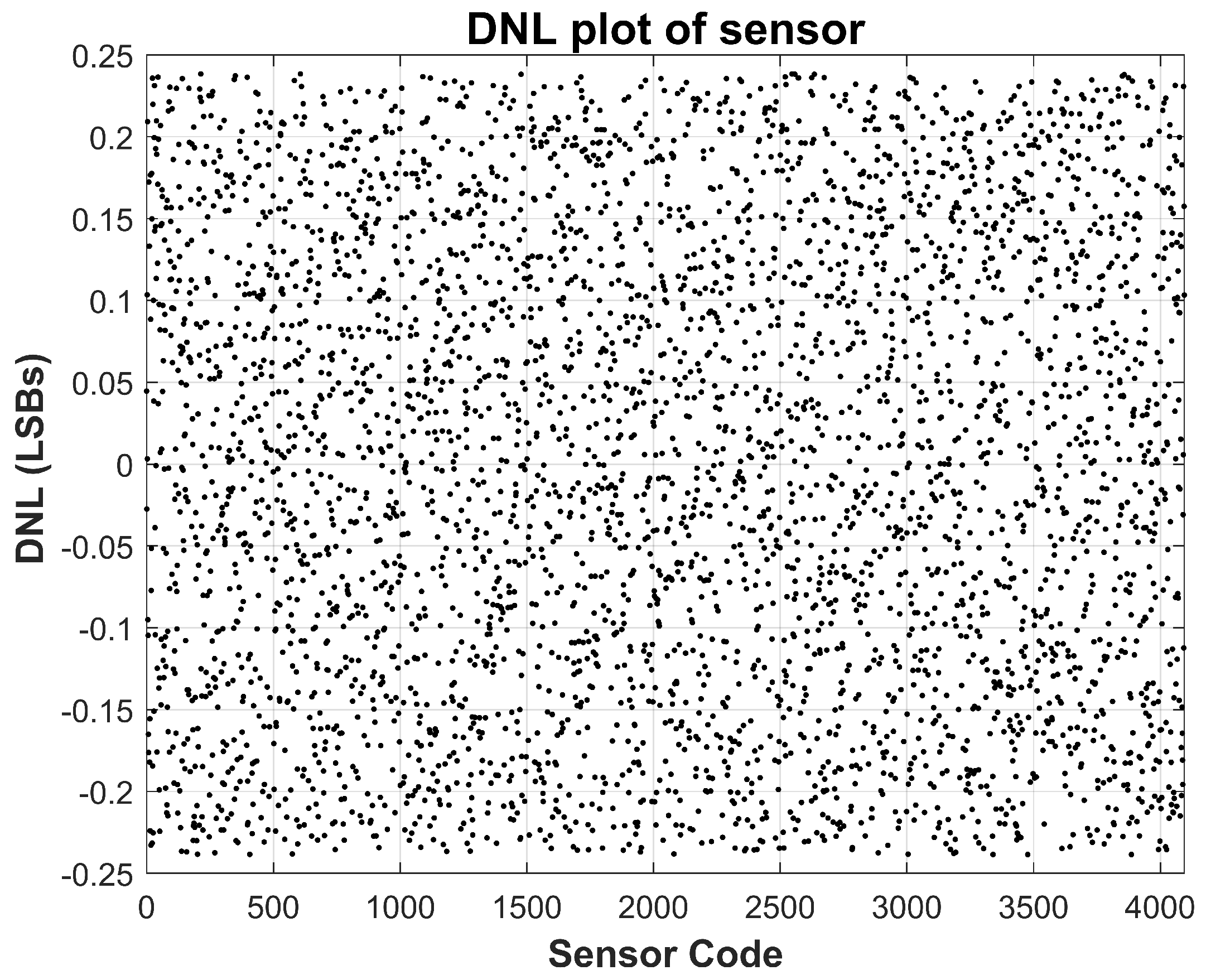 To further evaluate the resilience of the design under thermal stress, the same repeated measurements were performed at −40 °C and 125 °C. The results show that while the sensor exhibits increased variation at elevated temperatures—particularly in INL, which peaks around 2.9 LSBs at 125 °C—the overall behavior remains monotonic and within functional bounds. At cold temperatures (−40 °C), both INL and DNL values show slightly lower variation than at room temperature.