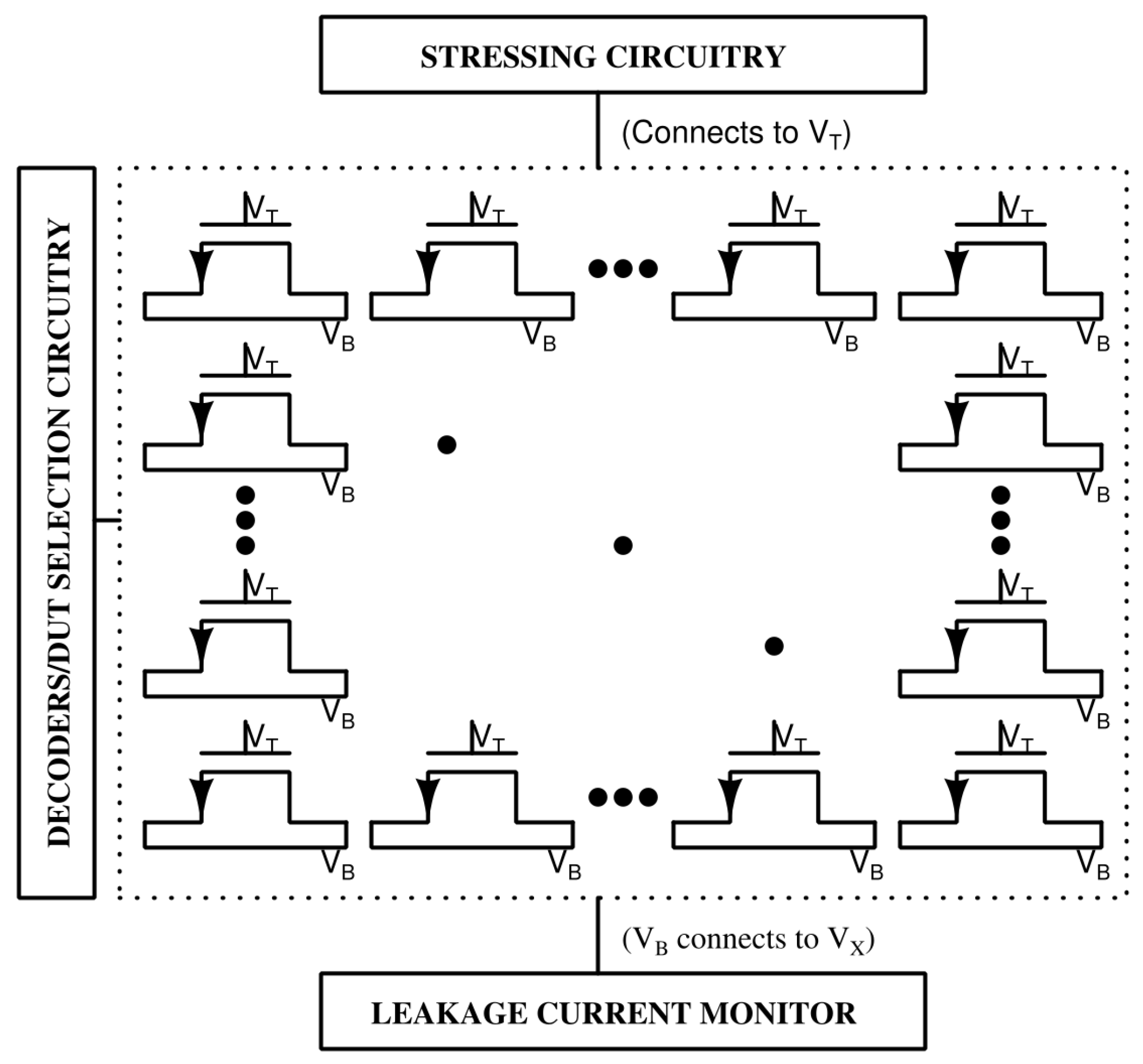 Figure 15, the sensor can be integrated with large-area capacitor arrays or gate stacks to enable parallel stress testing, supporting statistical reliability analysis of multiple DUTs. The decoder-based selection scheme allows flexible routing of stress voltages and measurement channels, making the architecture scalable for large test arrays.