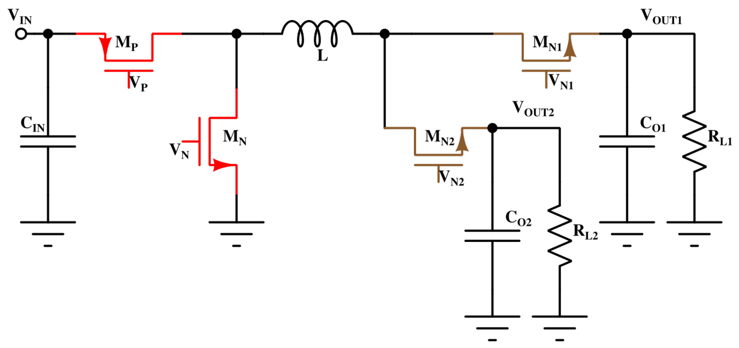 Figure 16 illustrates a Single Input Multiple Output (SIMO) converter architecture, in which multiple power transistors are driven from a shared input source. These power devices, especially the low-side switches, are often subjected to high electric fields and thermal stress, making them more susceptible to dielectric breakdown mechanisms. To monitor degradation in the field, a replica device can be incorporated into the power stage, biased similarly to the actual switches. The proposed leakage current sensor can then be connected to this replica to track stress-induced leakage over time. This approach enables early detection of reliability degradation, allowing for predictive maintenance or dynamic workload management in power delivery systems. Such integration is particularly relevant for automotive and industrial applications, where power converter failure can result in system-level faults or safety hazards.
